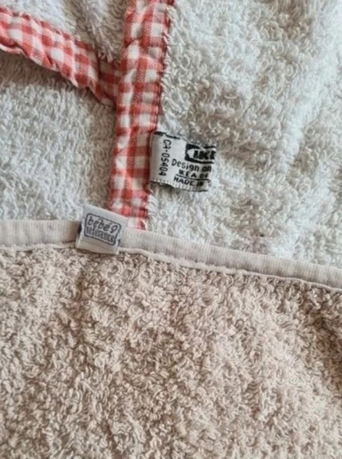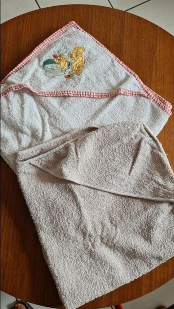 Lot de 2 serviettes éponge carré avec capuche, boubou pour bébé, chacune environ 73 cm de côté, une beige, une blanche, très bon état, pas de tâches ou trous, envoi soigne.