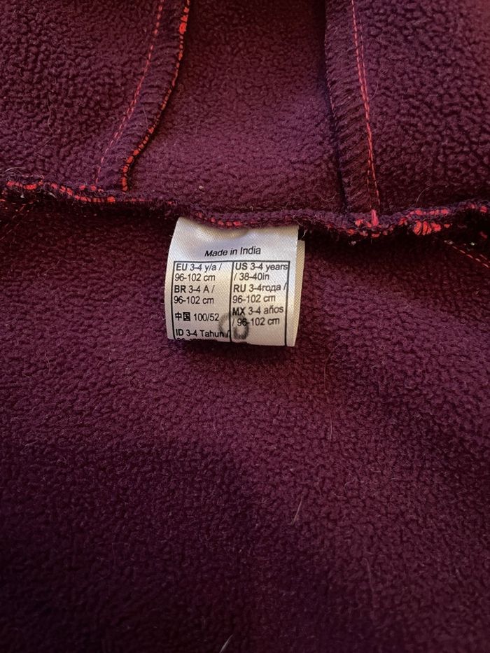 Veste polaire coupe vent. Taille 3-4ans mais taille petit, plutôt du 2-3ans. Parfait état. Sur l’étiquette figure le nom de ma fille (tampon encreur) qui était pour l’école.