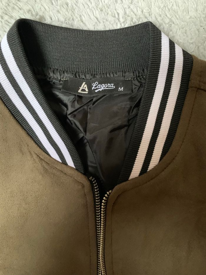 Veste homme style bomber en suédine marron. Coupe moderne avec col teddy et finitions rayées noir et blanc. Fermeture zippée et poches latérales. Très bon état, idéale pour un look casual chic.