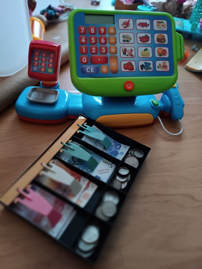 Caisse électronique + set de pièces et billets + 2 cartes de banque Très bon état