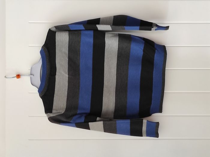 "Pull pour garçon, taille 4 ans Matière coton, col V Motif rayures avec 3 boutons décoratifs sur le col Coloris gris anthracite, gris clair et bleu 👉 Très bon état, peu porté 👉 Confortable et facile à assortir"