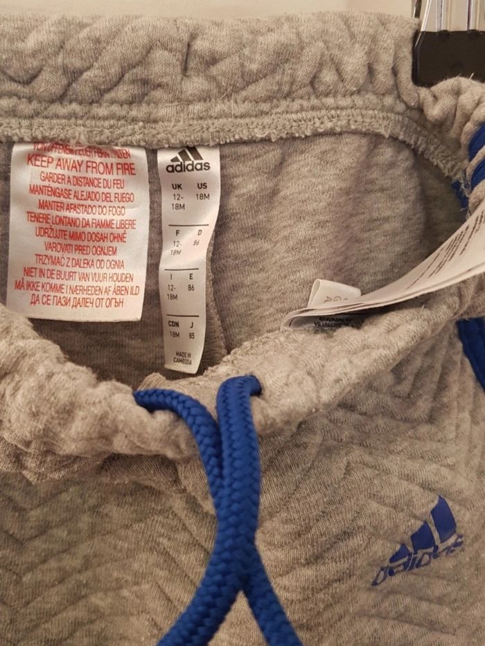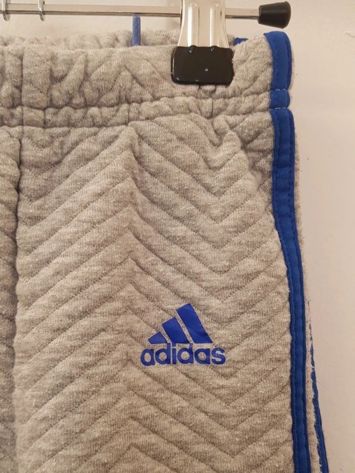 Bas de jogging en molleton gris, bandes bleu, très bon état, pas de tâches ou trous, envoi soigné. Adidas 12-18 mois