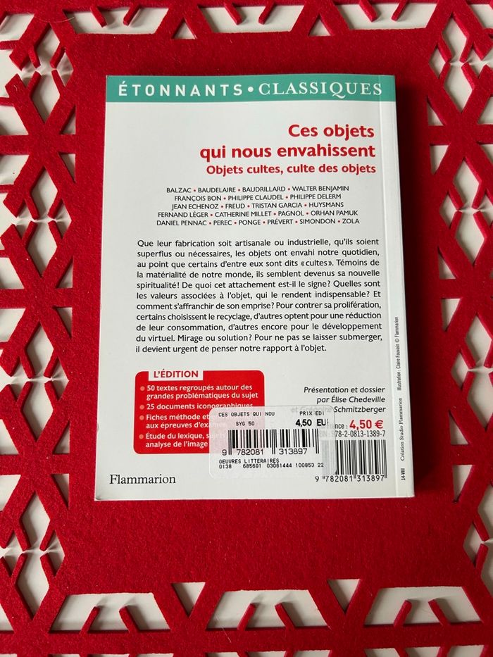 Je vends ce livre en excellent état. Titre : Ces objets qui nous envahissent : objets cultes, culte des objets : BTS Auteur: Elise Chedeville, Grégoire Schmitzberger Éditeur : Flammarion Genre : Scolaire Sous-genre : CAP - BEP - BAC PRO - BTS Thème : Enseignement supérieur, formation professionnelle, Cursus universitaire SHS, Lettres modernes Format : Poche Nombre de pages : 184 Hauteur : 18 cm Largeur : 13 cm Ces objets qui nous envahissent Objets cultes, culte des objets Que leur fabrication soit artisanale ou industrielle, qu'ils soient superflus ou nécessaires, les objets ont envahi notre quotidien, au point que certains d'entre eux sont dits « cultes ». Témoins de la matérialité de notre monde, ils semblent devenus sa nouvelle spiritualité ! De quoi cet attachement est-il le signe ? Quelles sont les valeurs associées a l'objet, qui le rendent indispensable ? Et comment s'affranchir de son emprise ? Pour contrer sa prolifération, certains choisissent le recyclage, d'autres optent pour une réduction de leur consommation, d'autres encore pour le développement du virtuel. Mirage ou solution ? Pour ne pas se laisser submerger, il devient urgent de penser notre rapport à l'objet. L'édition a 50 textes regroupés autour des grandes problématiques du sujet -25 documents iconographiques -Fiches méthode et entraînements aux épreuves d'examen « Étude du lexique, sujets d'exposés, analyse de l'image Voir moins Envoi rapide et très soigné.