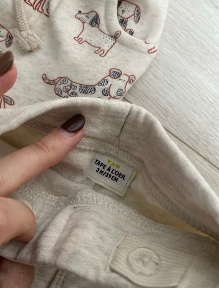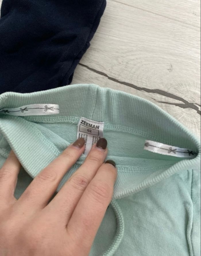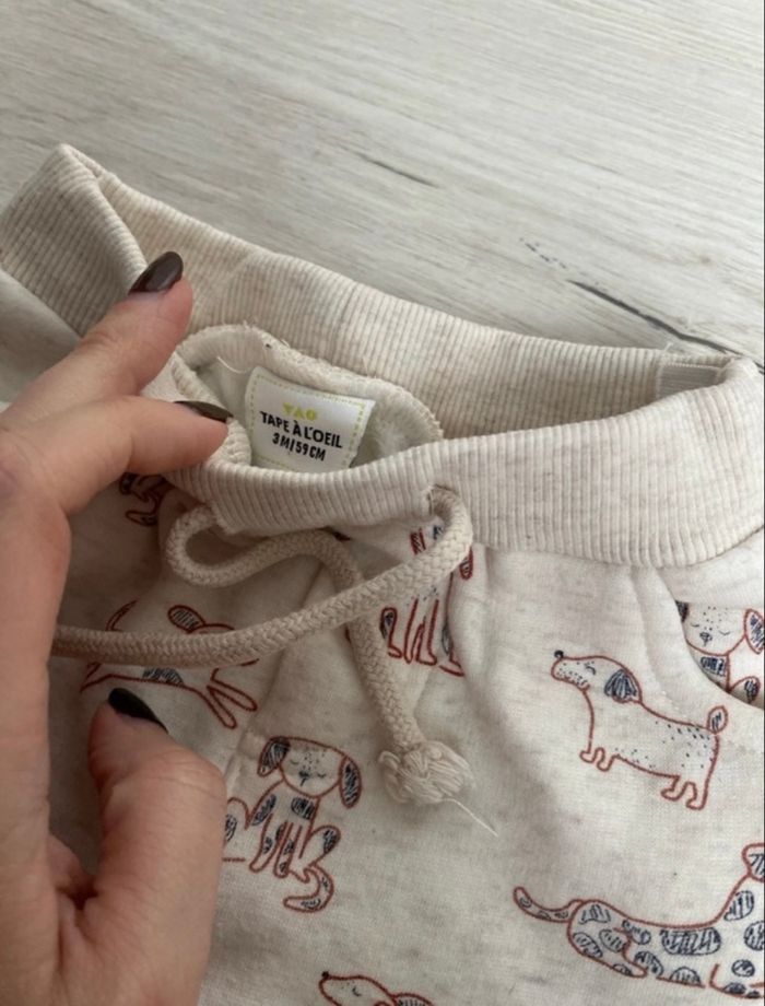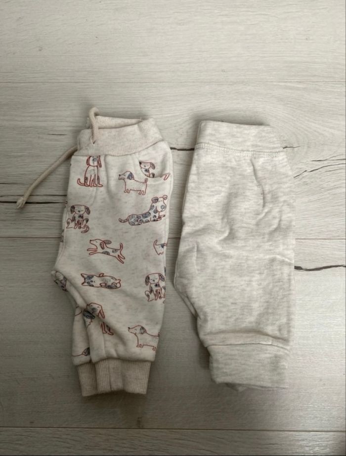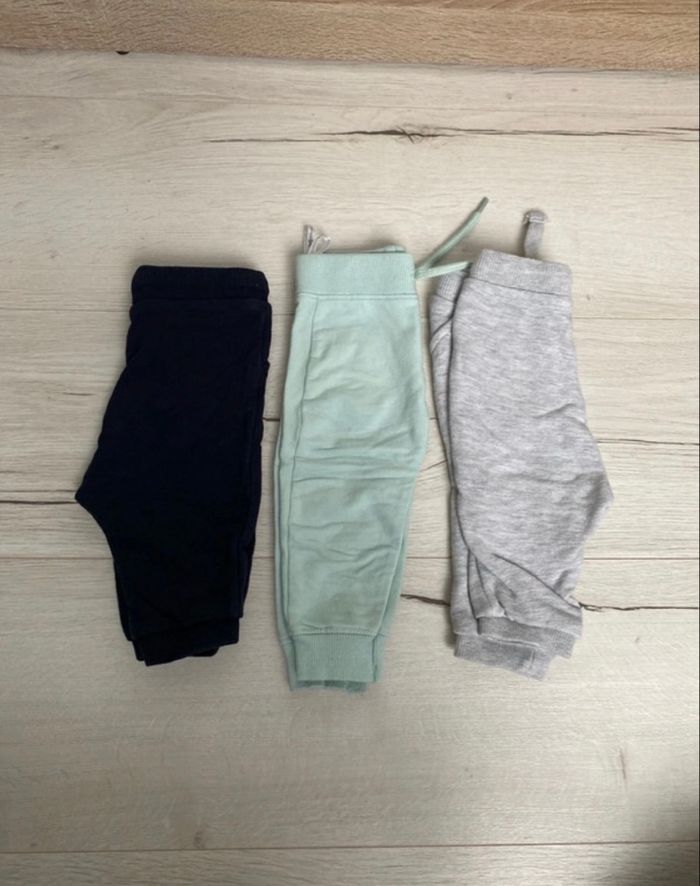 3 pantalons joggings (noir, vert d’eau et gris) Non molletonné à l’intérieur mais épais. Taille 3 mois Très bon état 2 pantalons bébé garçon (motif chien et beige) Beige molletonné à l’intérieur. Un jamais porté, l’autre deux fois. État neuf 3 mois - 59 cm Tape à l’œil