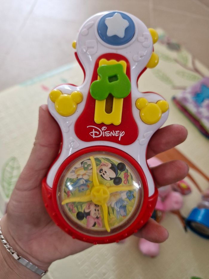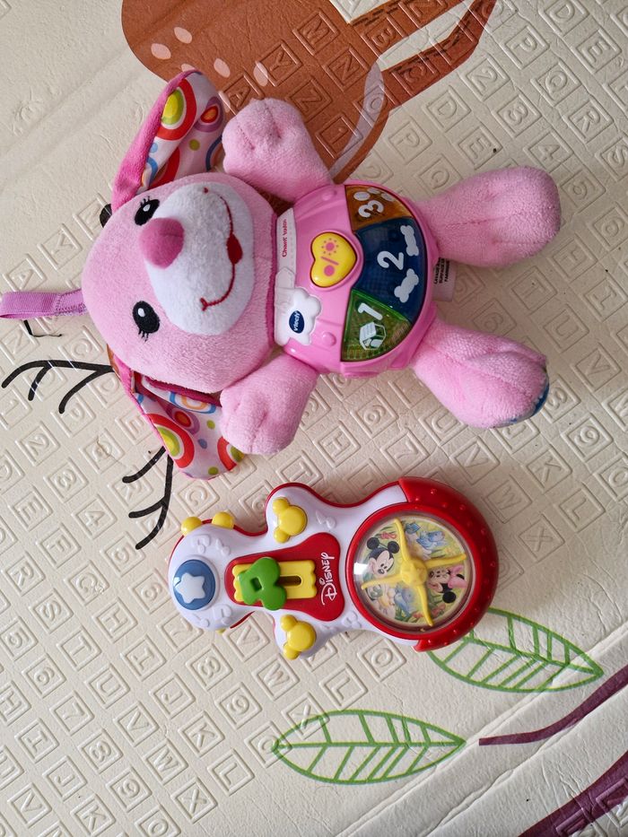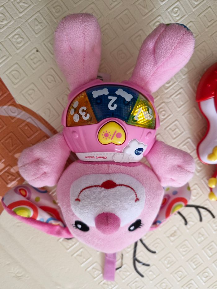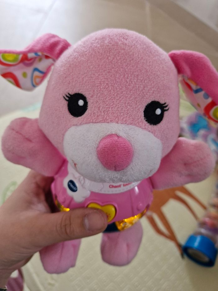 Le chien vtech fonctionne bien, chiffre, parle, musique S'allume et s'éteint sur le coeur pas de bouton on/off Petit guitare Disney musique