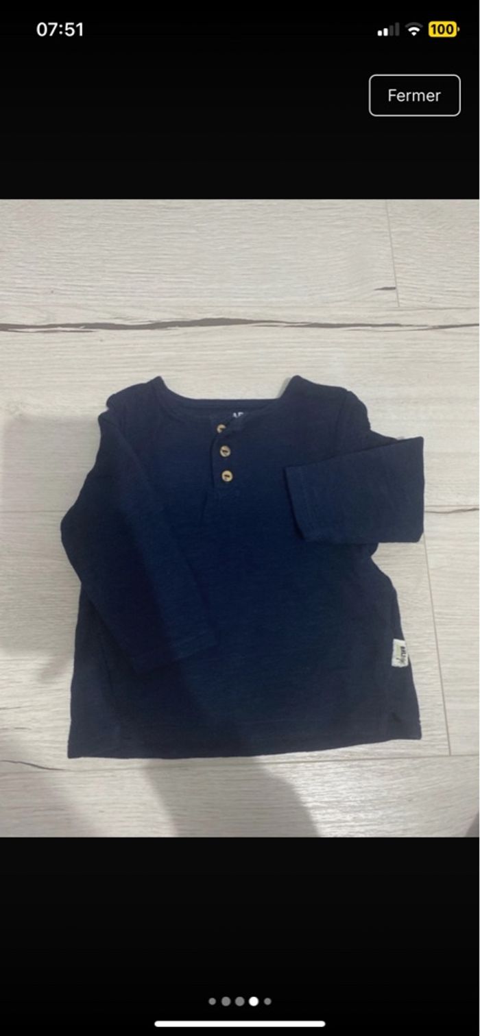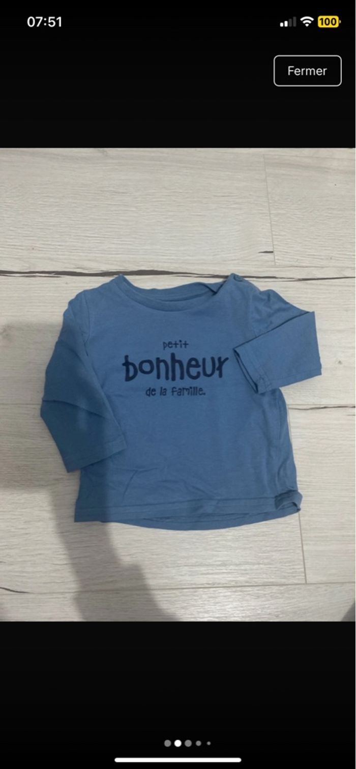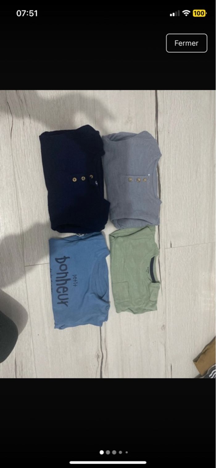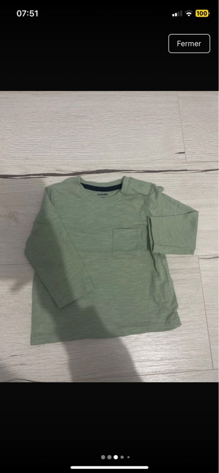4 tee shirts manches longues neuf sans étiquette. Le vert et le bleu clair jamais porté Les deux autres porté très peu de fois Marque kiabi et gemo 6 mois