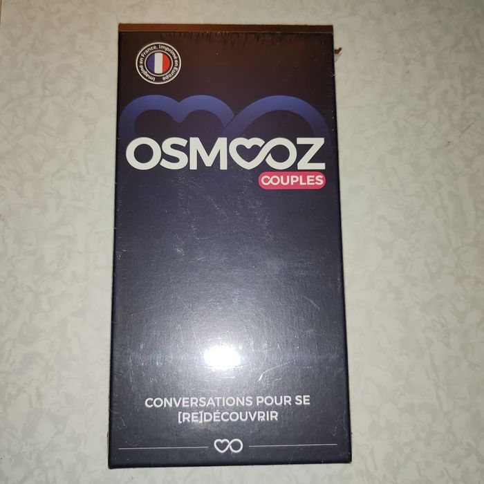 Installez-vous confortablement, piochez une des cartes du jeu, et ayez une délicieuse conversation avec votre moitié. Osmooz vous permettra au travers de 180 conversations remplies d’amour, de [re]découvrir votre partenaire. Osmooz c'est : Un jeu conçu par des couples, pour des couples. 180 conversations pour passer du bon temps ensemble 3 Niveaux d’amour selon la relation répartis en 5 grands types de sujets De l’amour en cartes ! Le principe est très simple, installez-vous confortablement, piochez une carte et ayez une délicieuse conversation avec votre moitié, du type : Préfères-tu parler toutes les langues du monde ou pouvoir parler aux animaux ? Pourquoi ? Comment me présenterais-tu en 5 mots à tes amis ? Si on devait faire une mission humanitaire ensemble, que ferions-nous ? 180 conversations répartie en 5 catégories de discussions : Révélations sur soi, Complicité, Nos Projets, Olé Olé et Défis. Osmooz, le jeu idéal pour un date, un cadeau ou juste passer de beaux moments de complicité à deux. De l’amour en cartes !