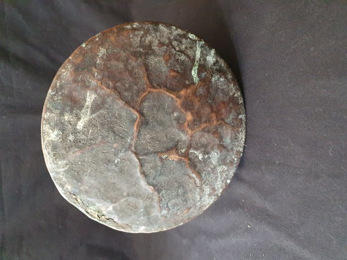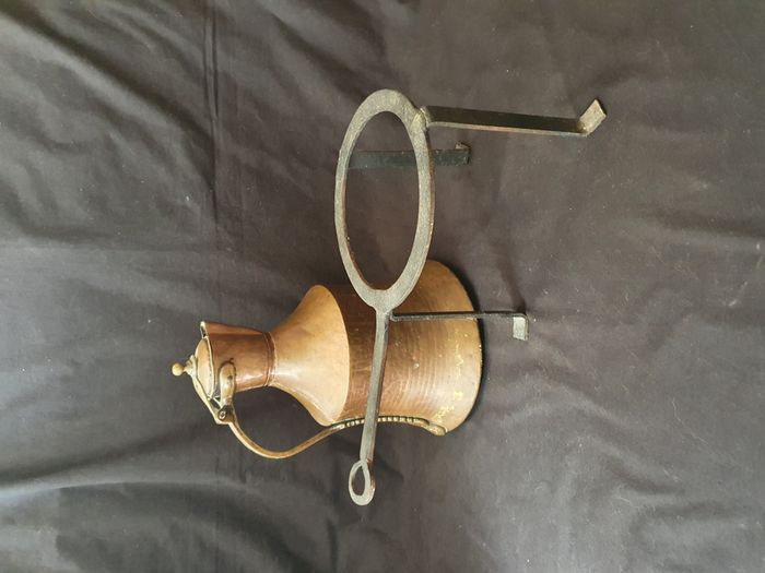 Ancienne grande théière en cuivre + support métal noir Dimensions Théière : Hauteur : 41 cm Diamètre de la base : 28 cm Diamètre du col : 8 cm Poids : 2,6 kg Dimensions support : Hauteur : 21 cm Diamètre : 25 cm Largeur avec la queue : 46,5 cm Poids : 1,5 kg Bon état