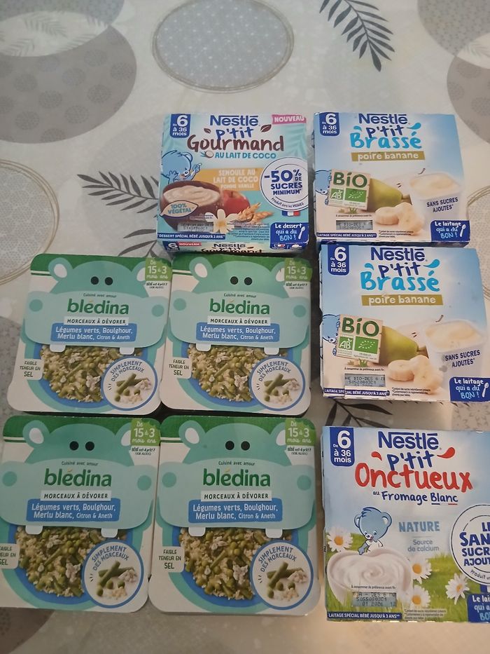 4 plats bledina morceaux à dévorer Legumes verts , boulghour , merlu blanc , citron& aneth. 07/02/2026 2 packs nestlé p'tit brassé poire banane 01/2026 1pack nestlé p'tit onctueux au fromage blanc 01/2026 1 pack nestle p'tit gourmand au lait de coco 01/2026