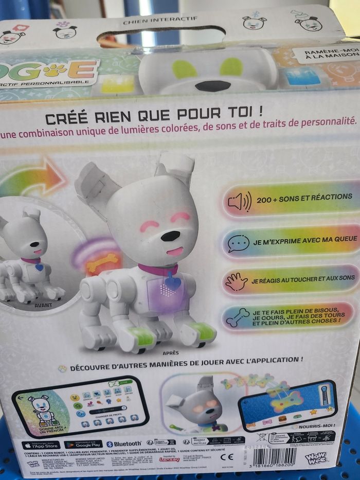 Neuf. N’hésitez pas à faire des lots. COMME UN VRAI CHIEN: Dog-E, le chien robot interactif est capable de répondre au toucher, au son et au mouvement, ce chien robotisé adore jouer, se promener, être caressé et nourri, imitant fidèlement les actions d’un véritable chien. PERSONNALISABLE VIA APPLICATION : Utilise l’application dédiée pour personnaliser ton chien robot Dog-E à volonté. Choisis la couleur de ses yeux, de ses pattes, de son cœur, et même son aboiement pour un compagnon unique. Regarde Dog-E prendre vie avec des traits personnalisés chaque fois que tu l’allumes ROBOT CHIEN AMUSANT : Avec le robot chien Dog-E, les enfants découvrent la responsabilité de s’occuper d’un animal tout en s’amusant. Ce robot interactif enseigne les bases du soin des animaux et la reconnaissance des signaux émotionnels sans les inconvénients d’un animal réel. MODES DE JEUX : Dog-E propose deux modes de jeu pour une interaction variable. Utilise-le sans application pour profiter de ses fonctions de base ou connecte-le à l’application pour accéder à des fonctionnalités avancées comme la nourriture virtuelle, l'apprentissage de tours et la communication via des messages LED sur sa queue. APPRENTISSAGE SENSORIEL : le chien robot intéractif Dog-E encourage le développement des capacités motrices et sensorielles chez les enfants. Il réagit de manière dynamique avec des mouvements et des sons, stimulant ainsi l’interaction et la coordination œil-main à travers le jeu.