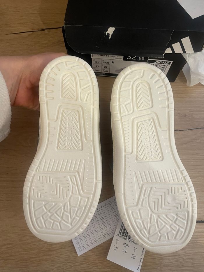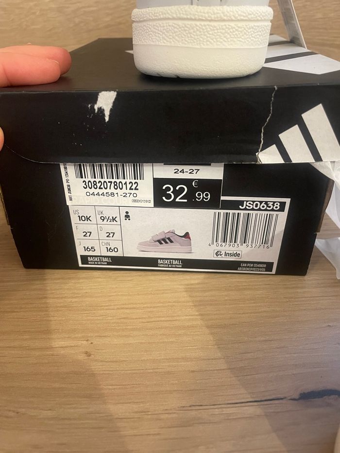Paire de baskets Adidas Rapid Court CF I pour enfant, pointure 27, neuves, jamais portées, avec boîte d’origine et étiquette. Couleur : blanc avec bandes noires et intérieur rouge. Fermeture par scratch, pratique pour les enfants. Modèle confortable et résistant, idéal pour le quotidien, l’école ou les loisirs. État : Neuf avec étiquette Pointure : 27 Marque : Adidas Envoi : Rapide et soigné 📦