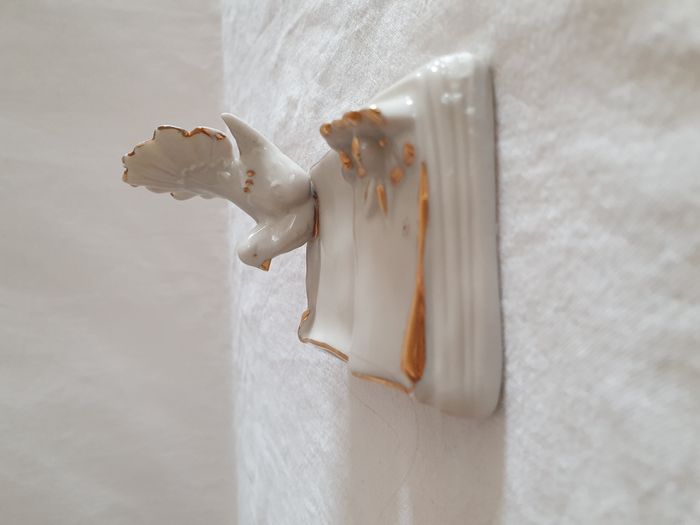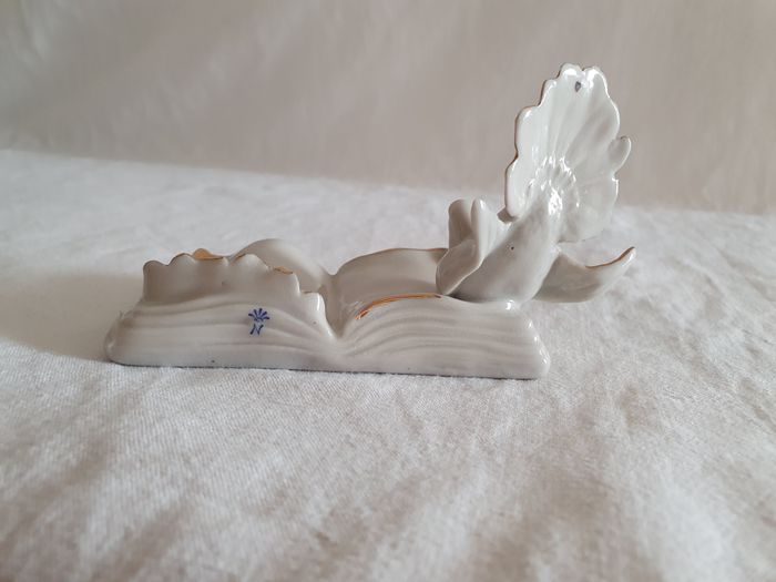 Statuette figurine oiseau colombe sur un livre décoration En porcelaine blanche et liseré or Estampillé N une couronne en bleu Dimensions : 7 x 11,5 x 7,5 cm Poids : 120 grammes Très bon état