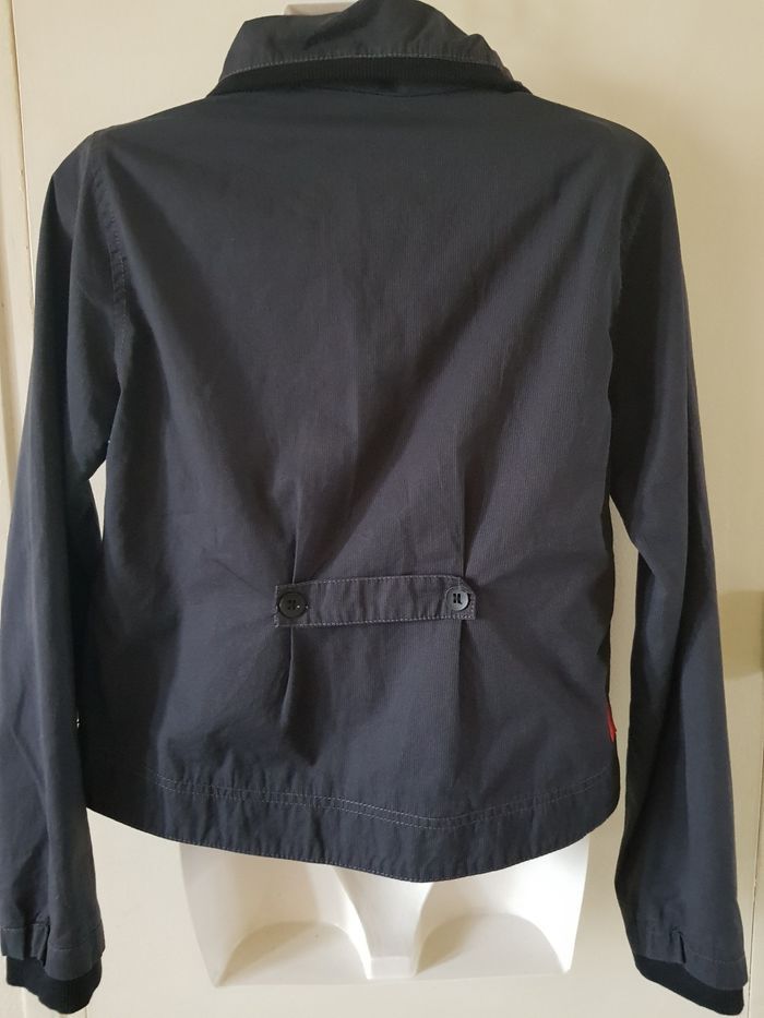 Veste courte Miss Captain, taille 36. Coupe structurée et féminine, coloris bleu marine. Col large élégant, fermeture par boutons sur le devant, deux poches plaquées. Détail de patte boutonnée au dos apportant du style. Matière légère, idéale pour la mi-saison. Tres bon état juste un petit défaut ( voir photo )