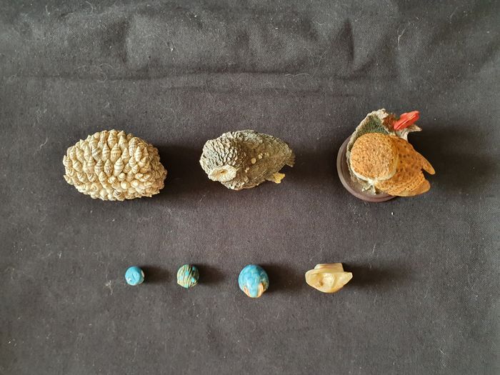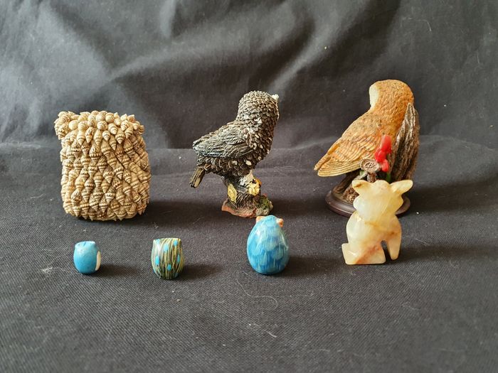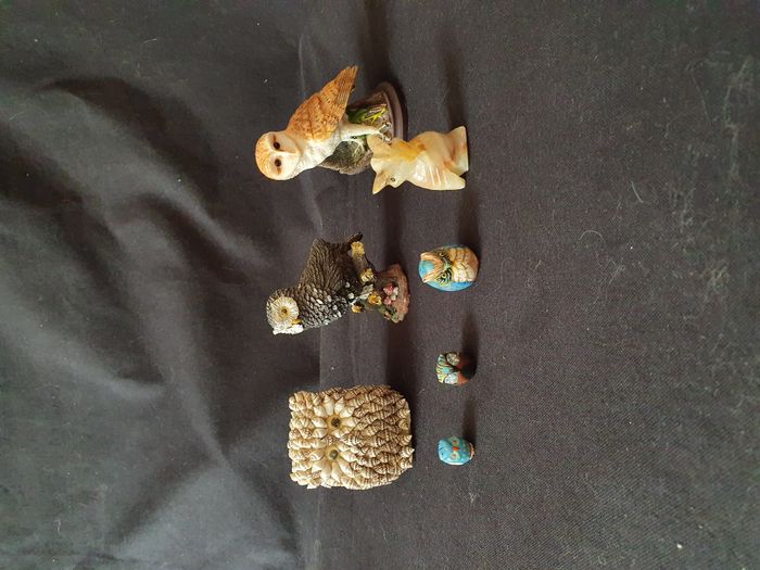 Lot de 7 statuettes figurines chouettes collection bibelots En plâtre dont une avec des coquillages collés ; 1 Hauteur 10 cm 1 Hauteur 8 cm 1 Hauteur 9 cm 1 en pierre Hauteur 5 cm 1 en terre cuite creuse vernie Hauteur 3 cm 1 Hauteur 2 cm 1 Hauteur 1,5 cm manque un peu de peinture sur la tête Très bon état