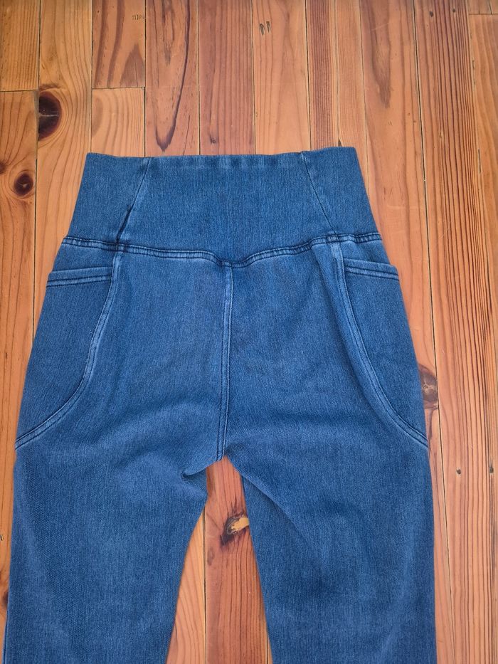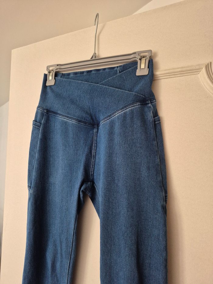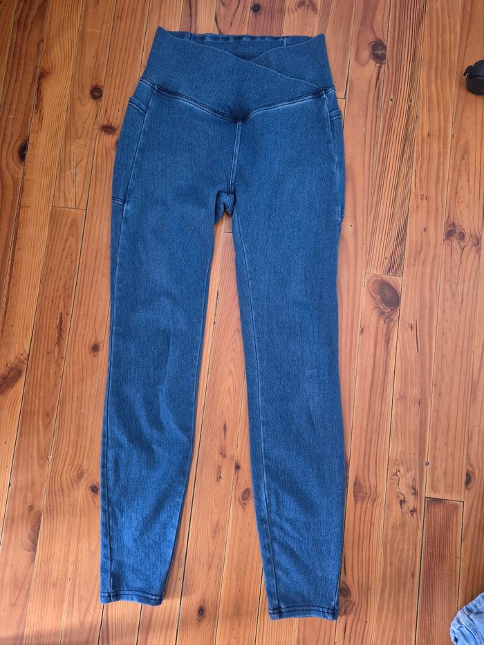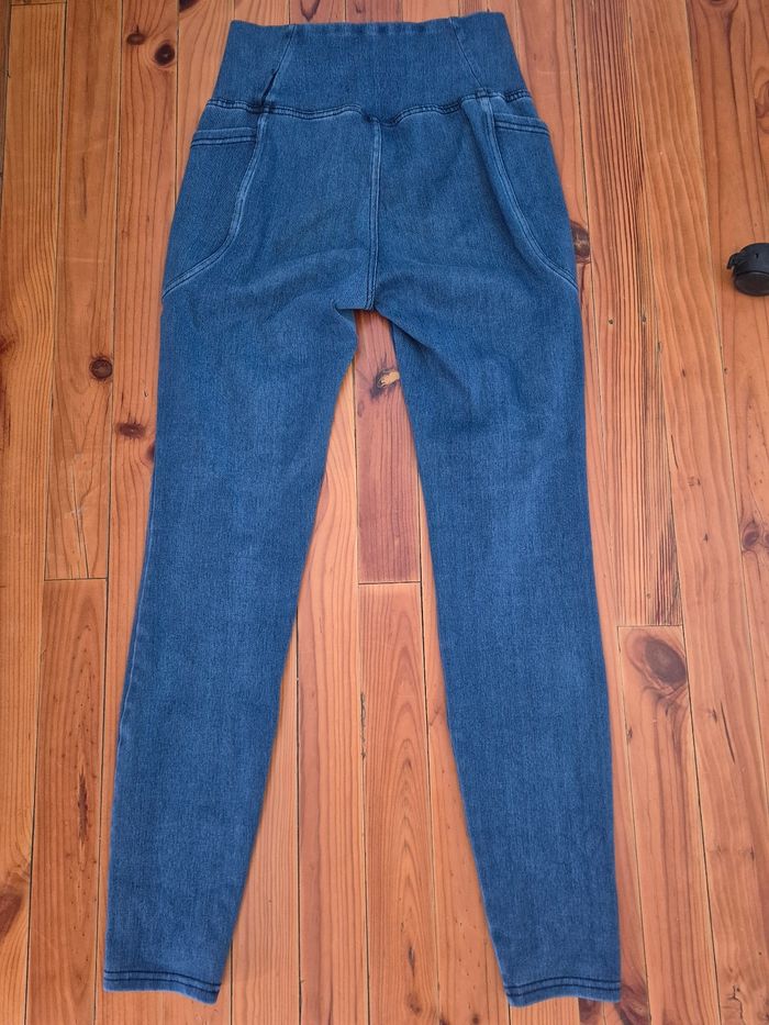 Jean slim , taille haute, devant croisé, sans bouton ni poche. Sans étiquette. Largeur taille 30cm, longueur entrejambe 68cm Correspond à une taille 12-14ans/ XXS