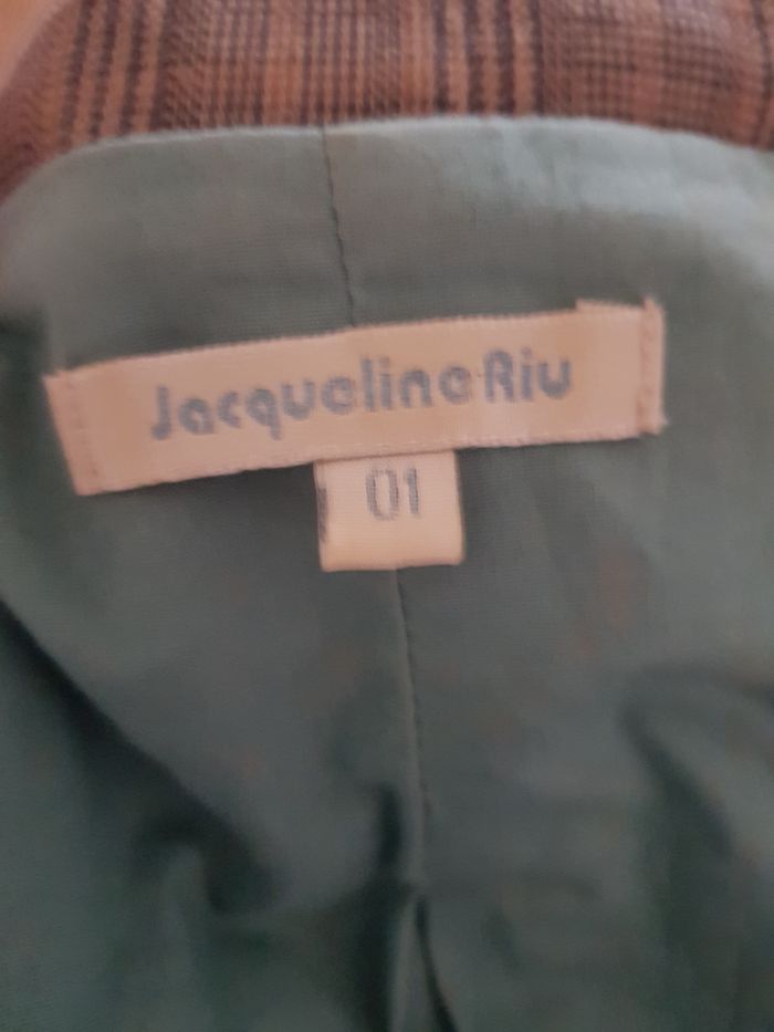 Veste Jacqueline Riu, taille 36 (01). Modèle à carreaux taupe/gris avec broderies florales bleu turquoise. Col tailleur, fermeture boutonnée, poches et pattes de serrage au dos. Pièce élégante et originale. Tres bon état