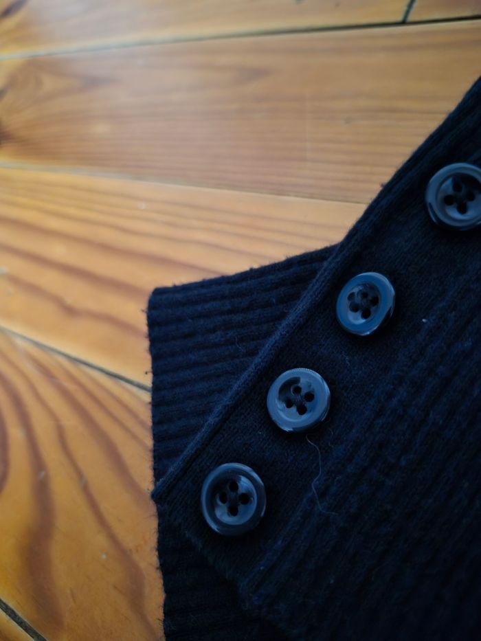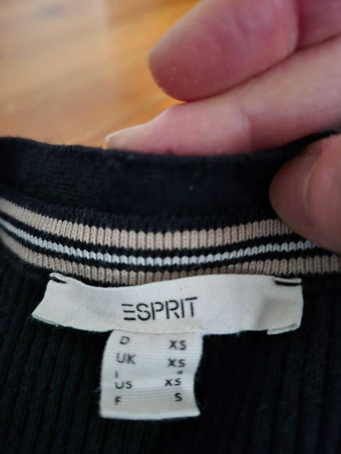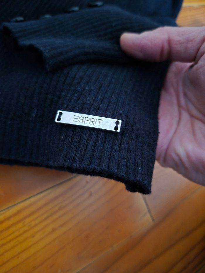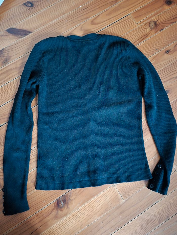 Gilet noir, à côtes et col en V. Détails boutons sur les manches. Marque Esprit, taille S. Largeur sous aisselle 40, longueur 52cm. 95% coton,5 % soie. En très bon état.