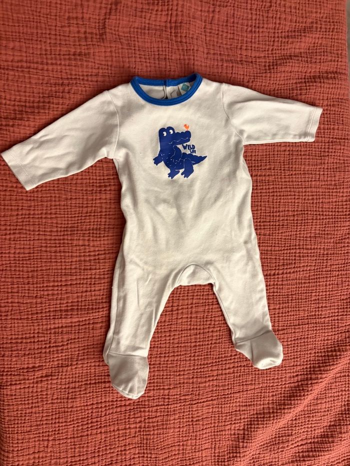 🧵Marque : aucune 📏 Taille : 3 mois 🌟 État : bon état 💡 Détails : pyjama de couleur blanc et bleu ouverture à pressions, motifs dinosaures 🎯 **Style / Occasion :** Confortable pour dormir ou sieste 🔍 Remarques : Aucun défaut 💌 Prix : prix négociable #bébé #pyjama #kiabi #3mois #confort #coton