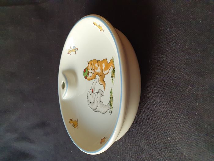 Assiette chauffante maintien au chaud enfant blanche dessin ours et canetons Limoges France Diamètre : 18 cm Hauteur : 5 cm Poids : 562 grammes Bon état Des petits manques de peinture voir les photos Pas de bouchon