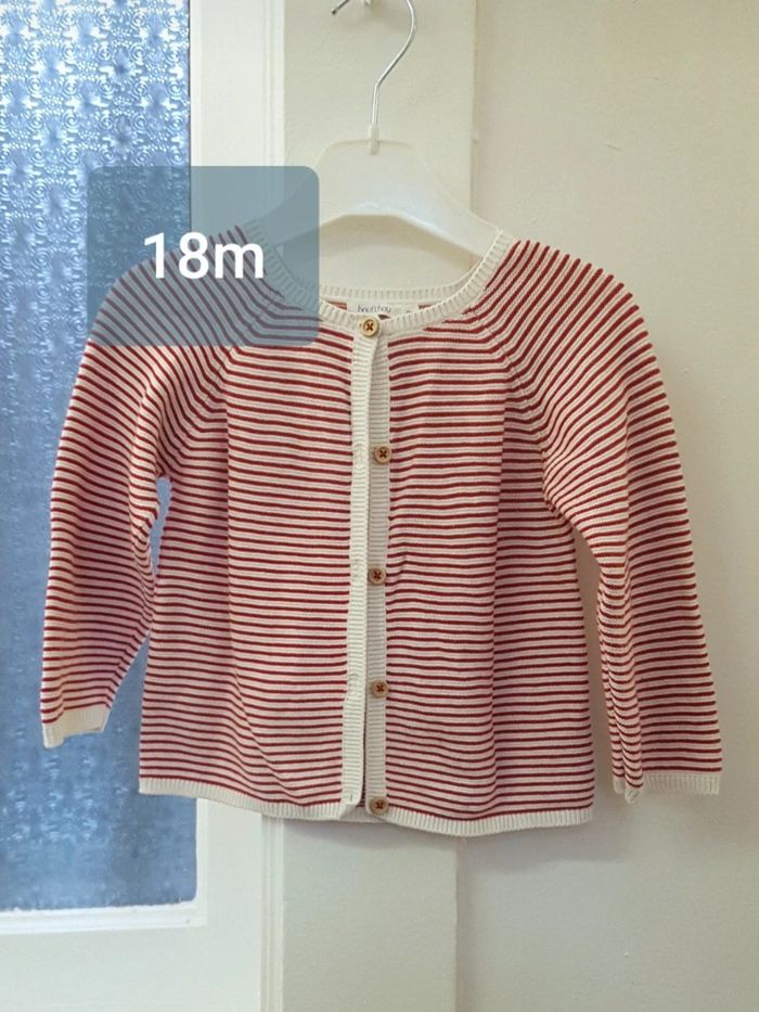 Gilet fine maille coton rayé rouge et blanc, très bon état, pas de tâches ou trous, envoi soigné. Boutchou 18 mois