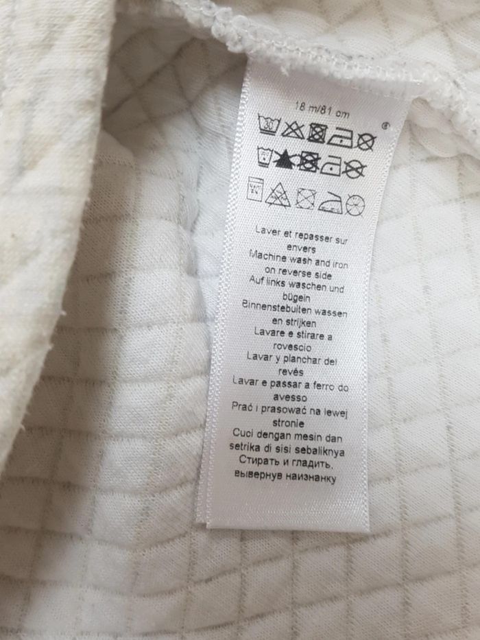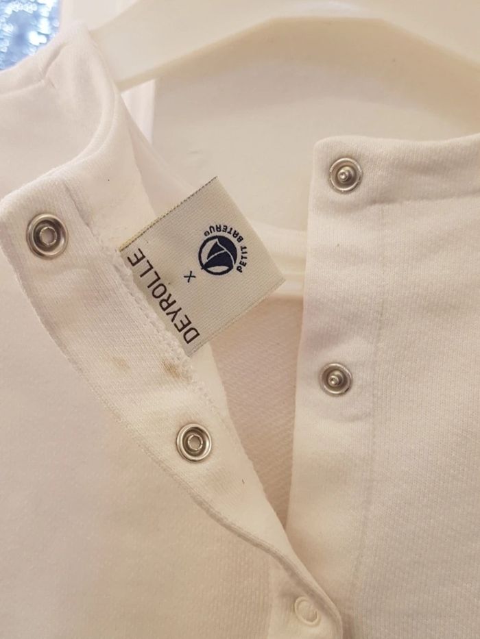 Robe en molleton blanche, pressions au dos, très bon état, pas de trous, juste 2 petites tâches au dos sous les pressions, voir photo. Envoi soigné Deyrolle et Petit Bateau 18 mois