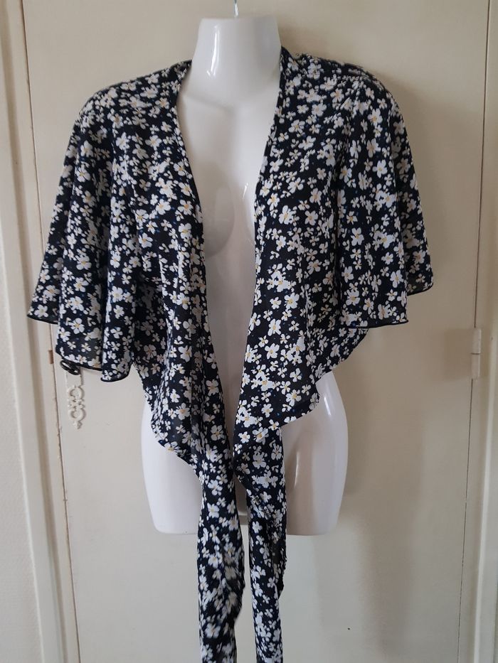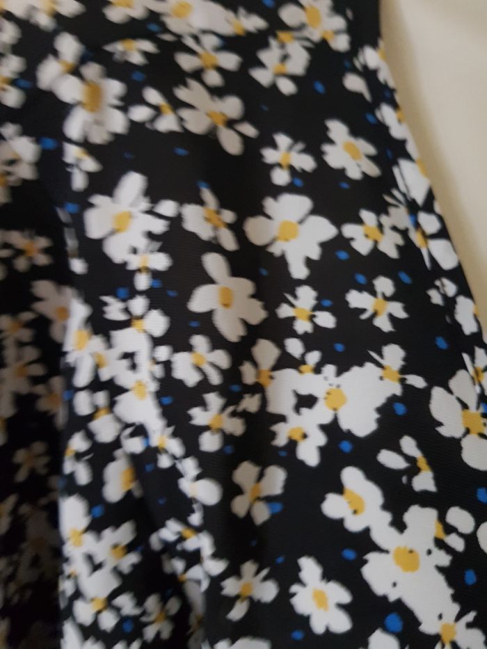 Top fluide à motif floral noir, blanc et jaune, manches courtes. Coupe légère et agréable à porter, Taille : L État : très bon état