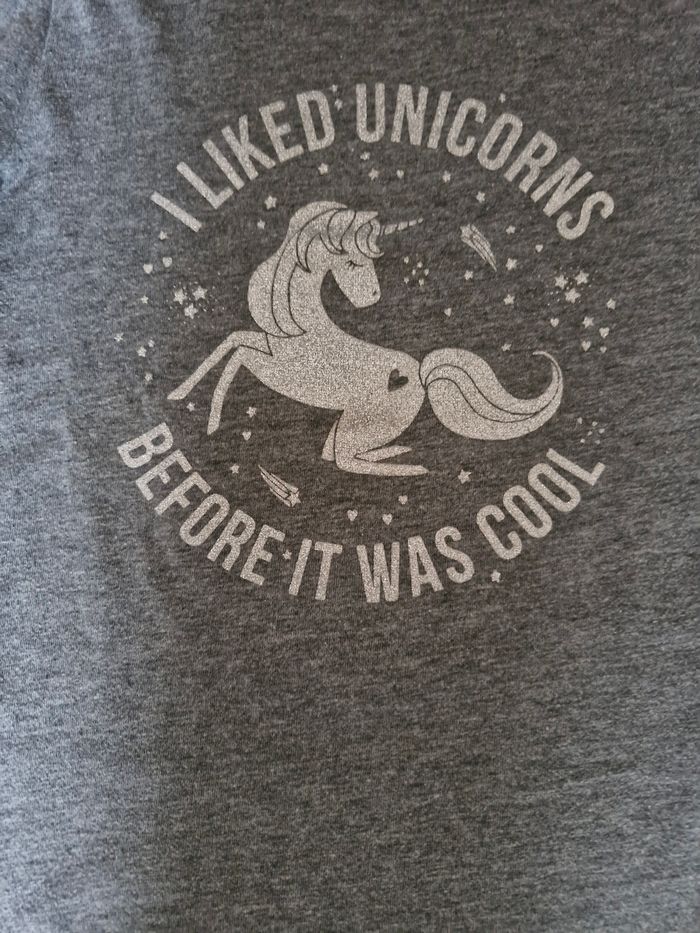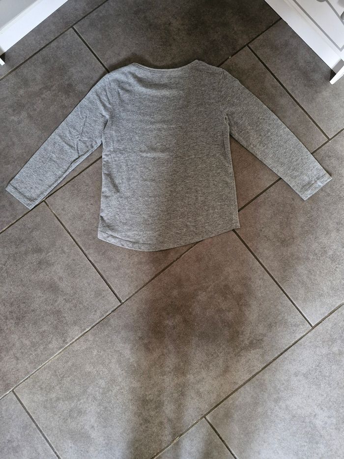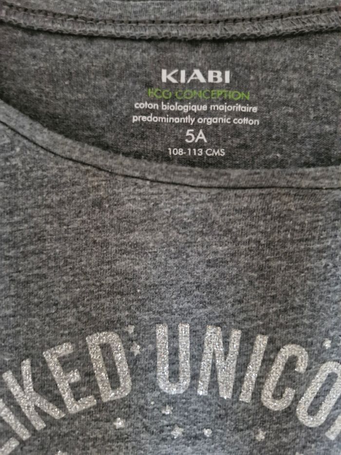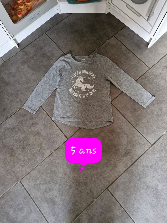 T-shirt manches longues fille 👧 Taille 5 ans Marque : Kiabi Gris motif licorne argenté Réduction sur les lots activé ☺️