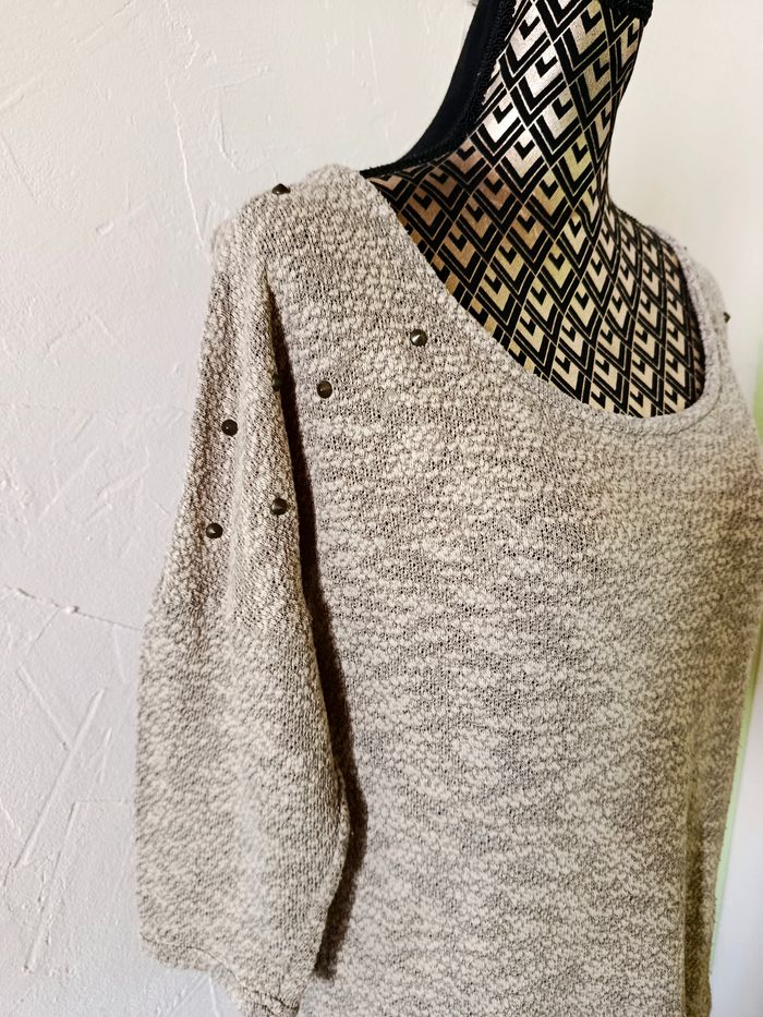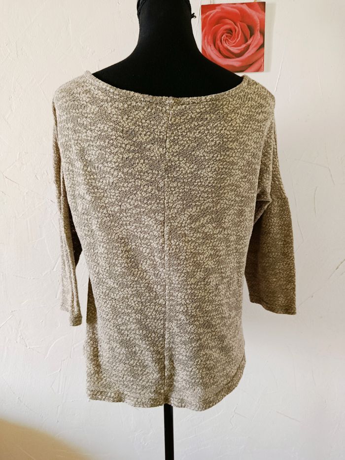 Joli pull léger manches 3/4, beige chiné, "clous" sur les épaules. Noté taille 4 qui correspond à un 42. Très bon état. Largeur à plat d'une aisselle à l'autre : 51cm, longueur depuis le dessus de l'épaule : 52cm environ (coupe légèrement arrondie). #frip_femme42