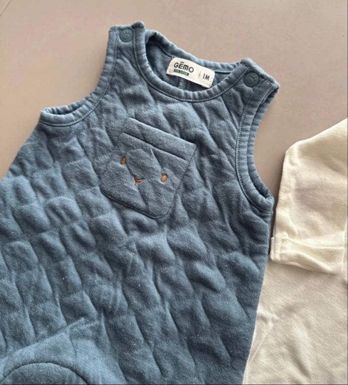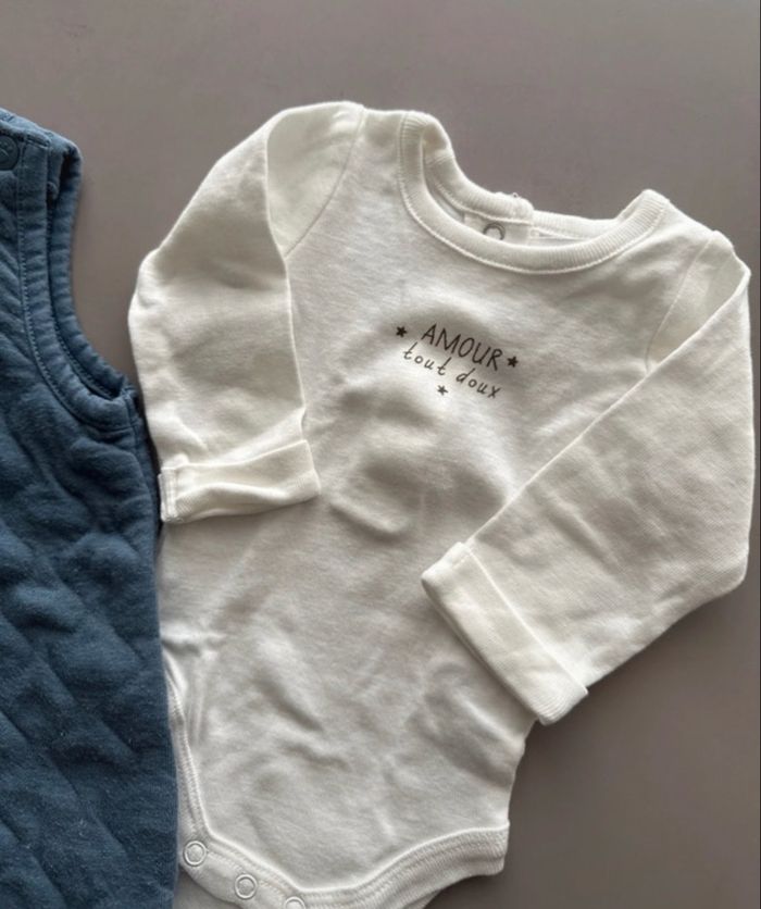Tenue salopette épaisse (portée plusieurs fois, état en photo). S’ouvre au niveau des jambes + body qui va avec (jamais porté) qui s’ouvre à l’arrière Taille 1 mois
