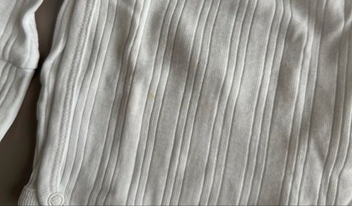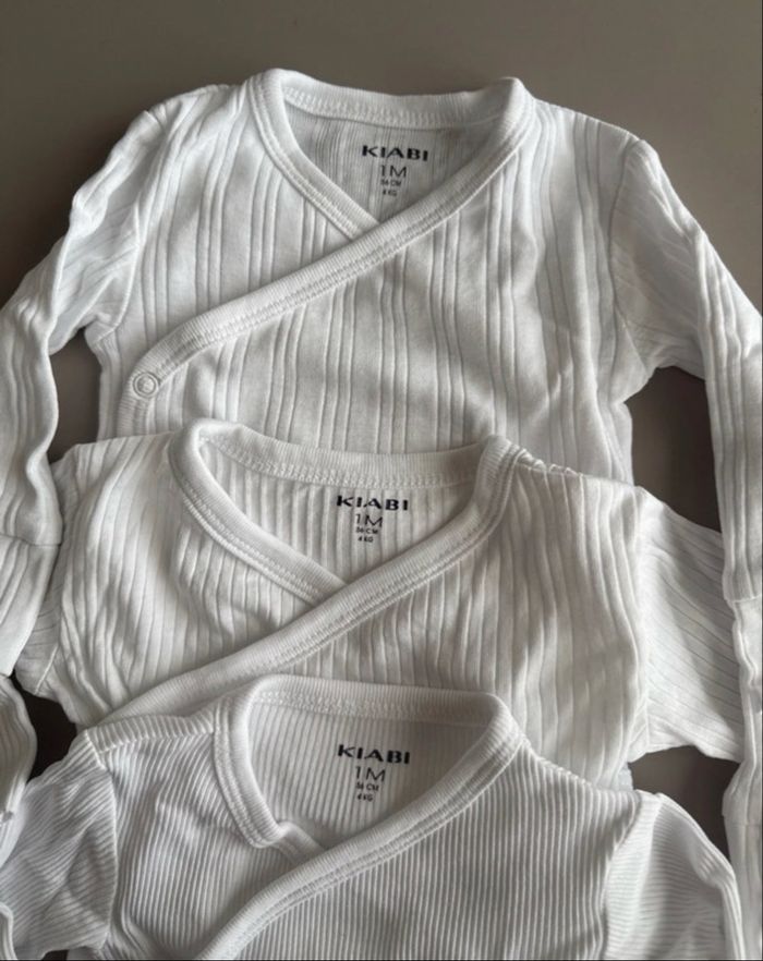Lot 3 body manches longues Kiabi Ouverture sur le devant Possibilité de choisir la taille fermeture au niveau de la couche ⚠️ le premier body à une petite tâche sur le devant. À voir sur la photo Taille 1 mois 56cm