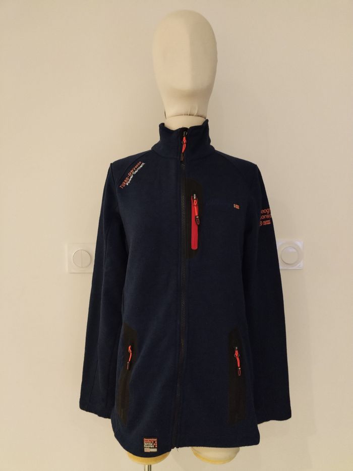 Bonjour 👋 Je vends cette veste bleu marine vintage logo authentique GEOGRAPHICAL NORWAY manches longues taille M/38 TBE 👕-Type de produit: veste 🏷-Marque: GEOGRAPHICAL NORWAY 📏-Taille: M/38 🎨-Couleurs: bleu marine -Caractéristiques: fermetures éclair ⚠️ Attention sur l'étiquette du vêtement noter  taille 4/XL mais taille plutôt en taille M/38. Les mensurations De l'épaule gauche à droite: 38 cm  De l'aisselle gauche à  droite: 48 cm Longueur du haut en bas: 71 cm Longueur des manches: 66 cm