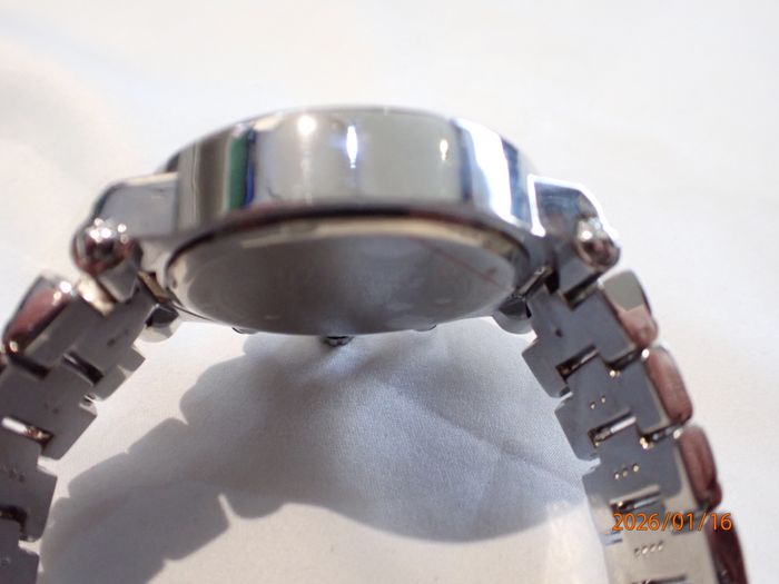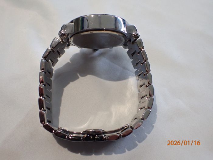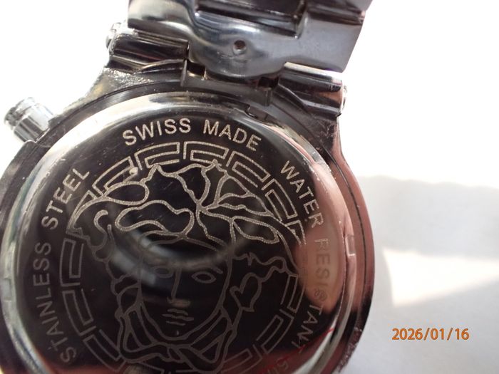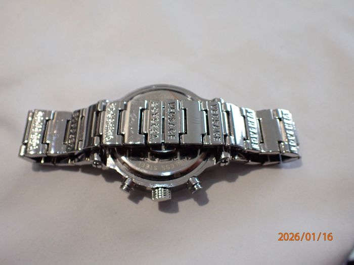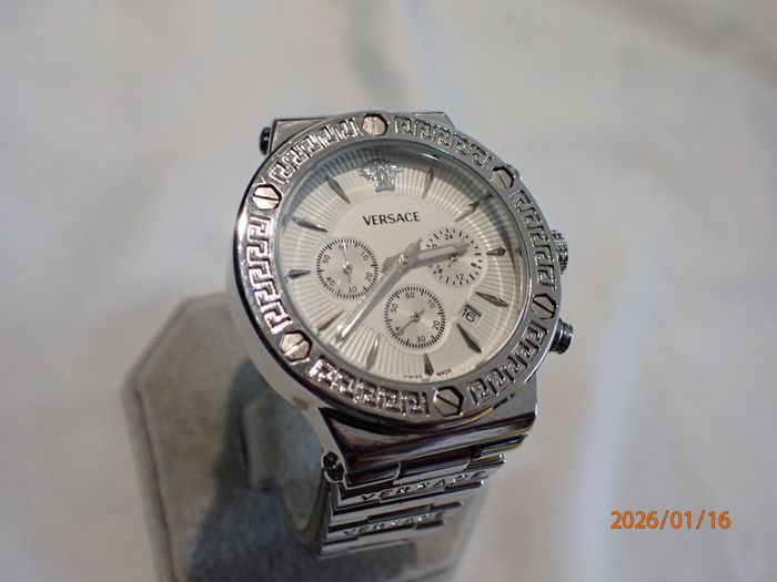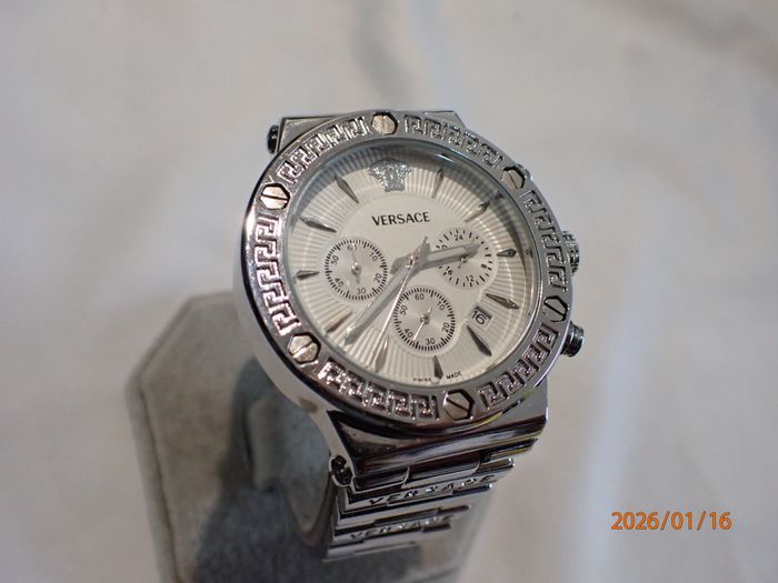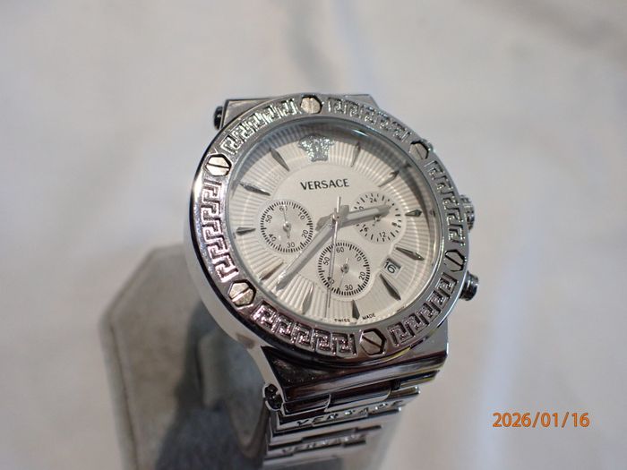 CHIC-ELEGANTE MONTRE MASCULINE VERSACE SUISSE DE 2017 OPTIONS CHRONOMETRE A POUSOIRS RAPIDES ET GUICHET DATE, design raffiné au cadran épuré chic d'une luxueuse présentation , état visuel général remarquable d'exception , fonctions globales ponctuelles et précises , boitier acier chromé avec poussoirs chronomètre rapides et sa lunette orné de visses et motifs déco, cadran blanc un peu écrue à sérigraphies partielles en soleil , signé et siglé à la marque & Suisse made celui-ci incluant les annexes chrono et son guichet dateur, index Hrs gouttes d'eau allongées , verre minéral plat intact , aiguilles principales bi-teinte à fine trotteuse, mise à l'heure par tirage du Bt strié du coté à 2 positions (1 cran pour la date et l'autre pour les Hrs) bracelet de maillons à signature Versace et sa boucle papillon sécurit ajustable et ces maillons démontables" proche du neuve" fond acier chromé clipsé orné du logo à visage Versace Réf 27C 115 8554, Suisse Made, W/R 5 ATM, Stainless steel mouvement modulaire quartz Langexin CO ,calibre LS20 de haute fiabilité japonaise sans surprise, Dimensions hors couronne; Diam 44 mm, épaisseur 11 mm , bracelet à entraxe de cornes 24 mm pour 18 mm en boucle , son observation atteste un fonctionnement stable ponctuel et d'une excellente précision des annexes chrono , livrée avec une pile neuve en place, état visuel d'exception proche du neuf infos sur simple demande, emballage de protection impératif avec assurance plus suivi de rares absences professionnels peuvent éventuellement retarder un peu certaines demandes ou livraison, par avance merci pour votre compréhension objective