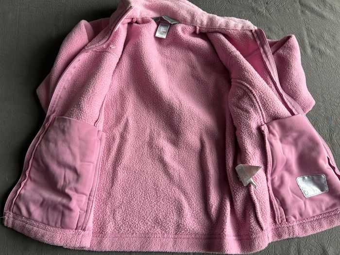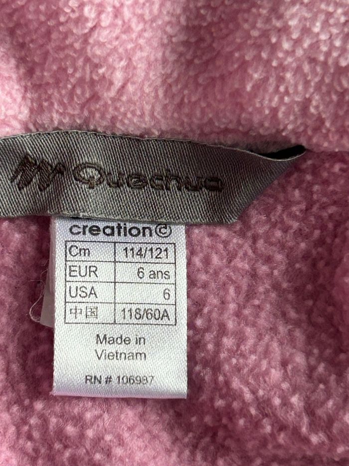 veste polaire fille, légère, couleur rose. Taille 6 ans de la marque « Quechua » (Décathlon). Entièrement zipée devant. 2 poches côté. En très bon état.