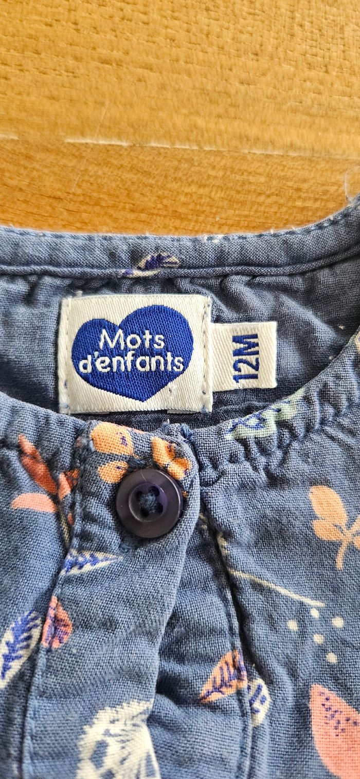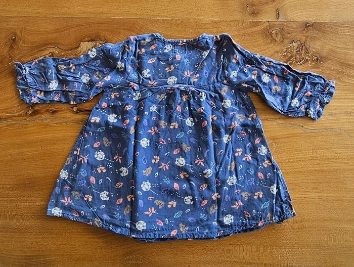 Tunique manches longues bleu pour bébé fille. Dessin brodé sur l'ensemble de la tunique. Ouverture boutonné sur le devant. Col rond. Élastique aux poignets. Doublé d'un voile. Porté 1 une fois donc comme neuve. Aucune tâche, ni trou 👌
