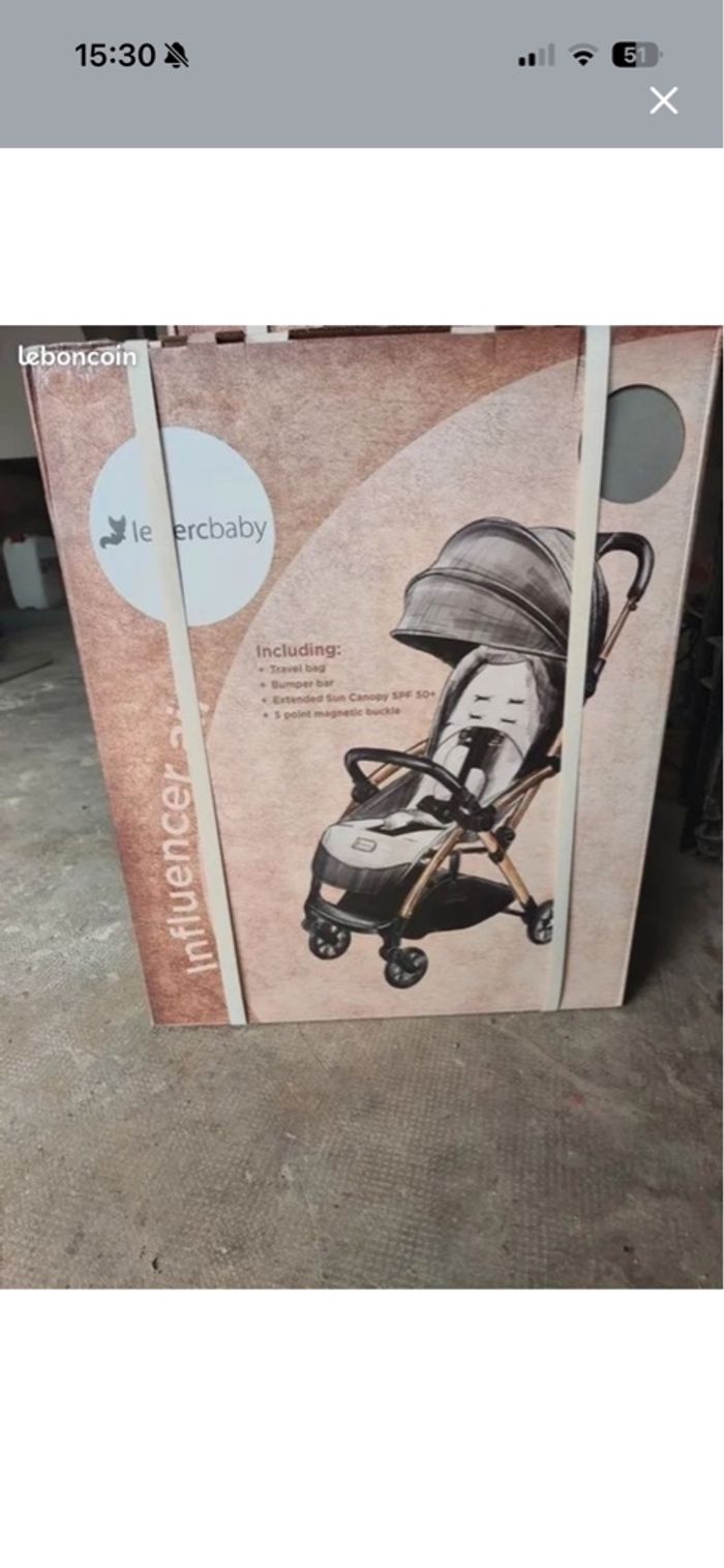 Poussette leclerc baby neuve dans son carton en gris ou en beige Pliage automatique 1 main Ultra compact, légère Porte gobelet biberon Barre de jeu sécurité 3 position, allongé, demi assise, assis Passe en bagage cabine