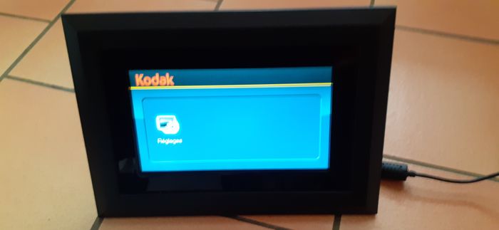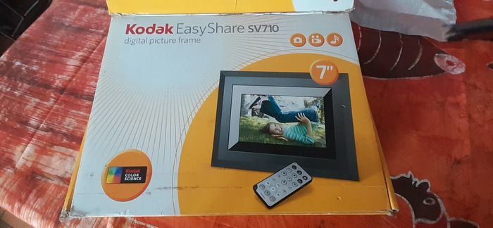 Vends cadre numérique "Kodak Easy Share SV710", 7", état neuf, avec télécommande, adaptateur secteur, CD du logiciel Kodak, guide de démarrage, câble USB, logement pour carte mémoire ou port USB. Notice d'utilisation. Dimensions 17,5 x 24 cm.