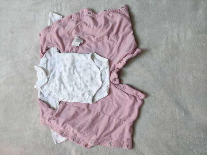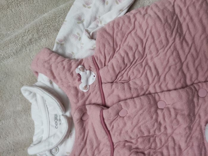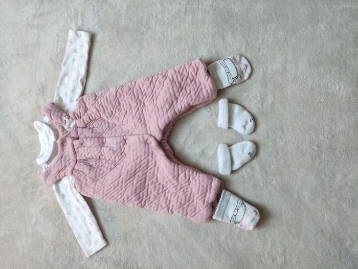 Combinaison 1 mois Obaïbi avec son body assorti, j'ai ajouté une paire de bottons écru Kiabi et une paire de chaussettes fantaisie. En très bon état. Vêtements portés avec soins, remplis de souvenirs et prêts pour une nouvelle histoire 💖