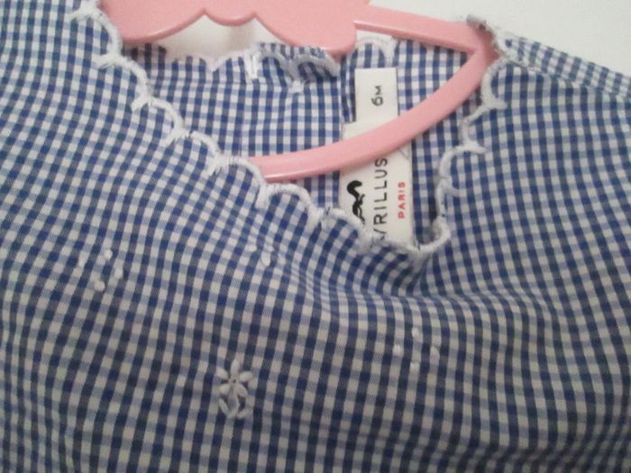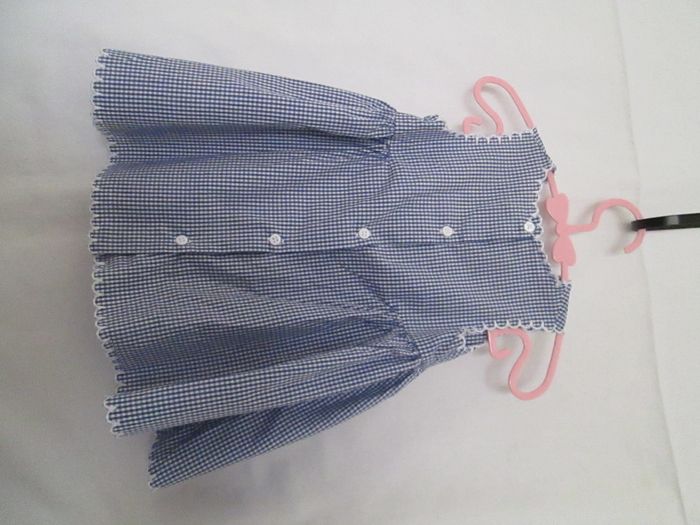 Vends robe vichy bleue Cyrillus. Petites fleurs blanches brodées sur le devant. Feston autour des manches, du col et en bas de la robe. Boutonnage dans le dos sur toute la longueur. Taille 6 mois. Comme neuve, portée une journée. Pour plus de choix, allez consulter mes autres annonces.