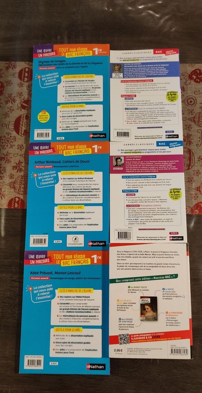 Bonjour Voici un lot de 6 livres pour le bac de français en très bon état. Il y a 3 oeuvres avec les livres d'analyse qui vous avec. Les œuvres sont : _ déclaration des droits de la femme et de la citoyenne _ les cahiers de Douai de Rimbaud _ Manon Lescaut de Abbé Prevost N'hésitez pas à me contacter pour plus de renseignements ou pour plus de photos. A bientôt