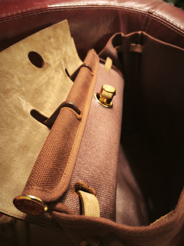 Modèle : Herbag Sac MM Matière : Toile enduite / cuir Bridon Couleur : Havane Finition métal : Permabrass (doré) Référence : 036220CP41 Année indiquée : 2007 (st 407) Légères traces sur le cuir dû aux quelques utilisations.
