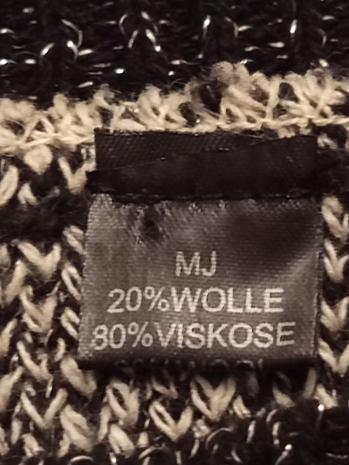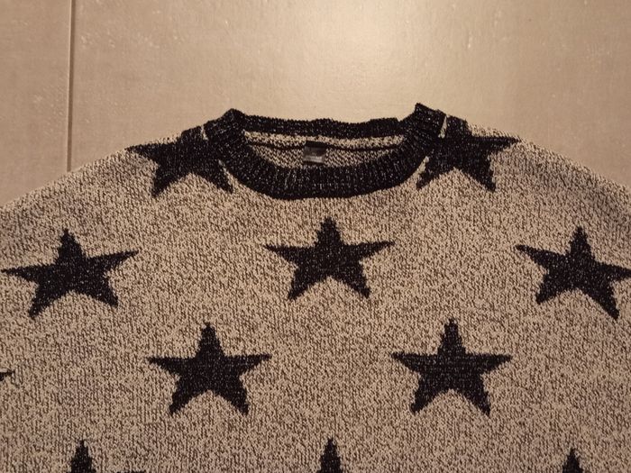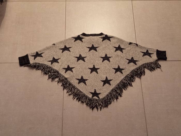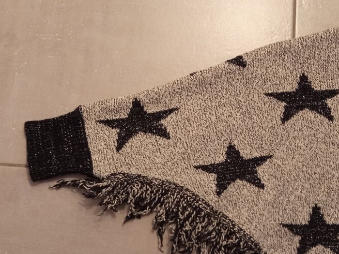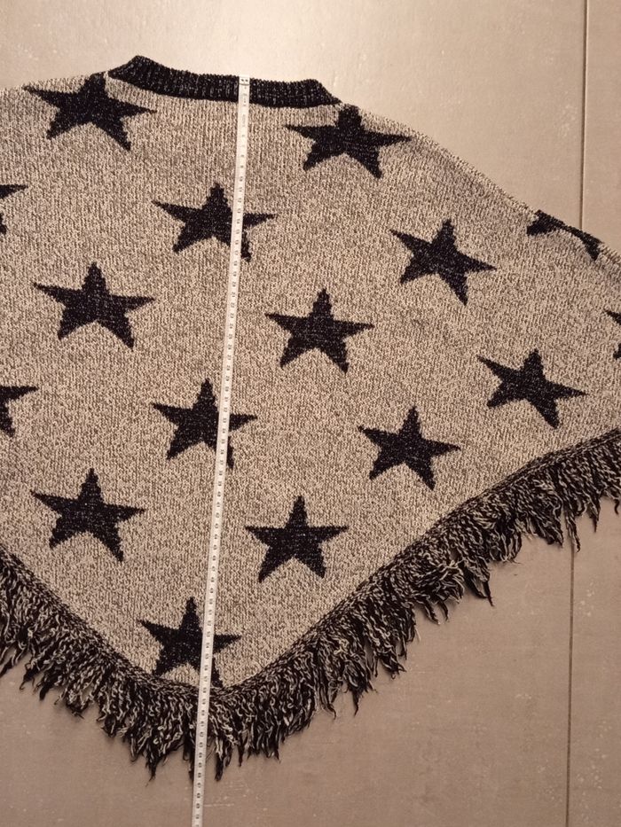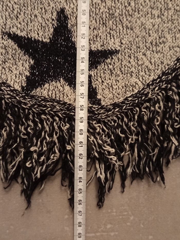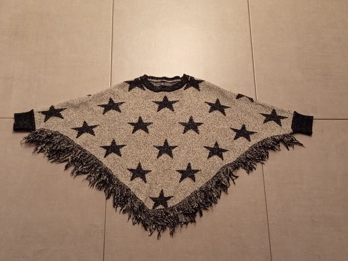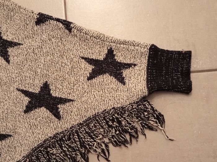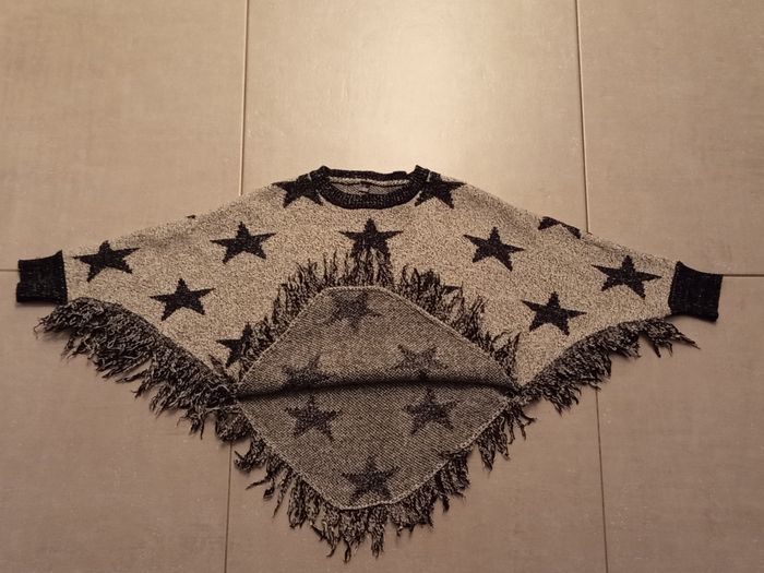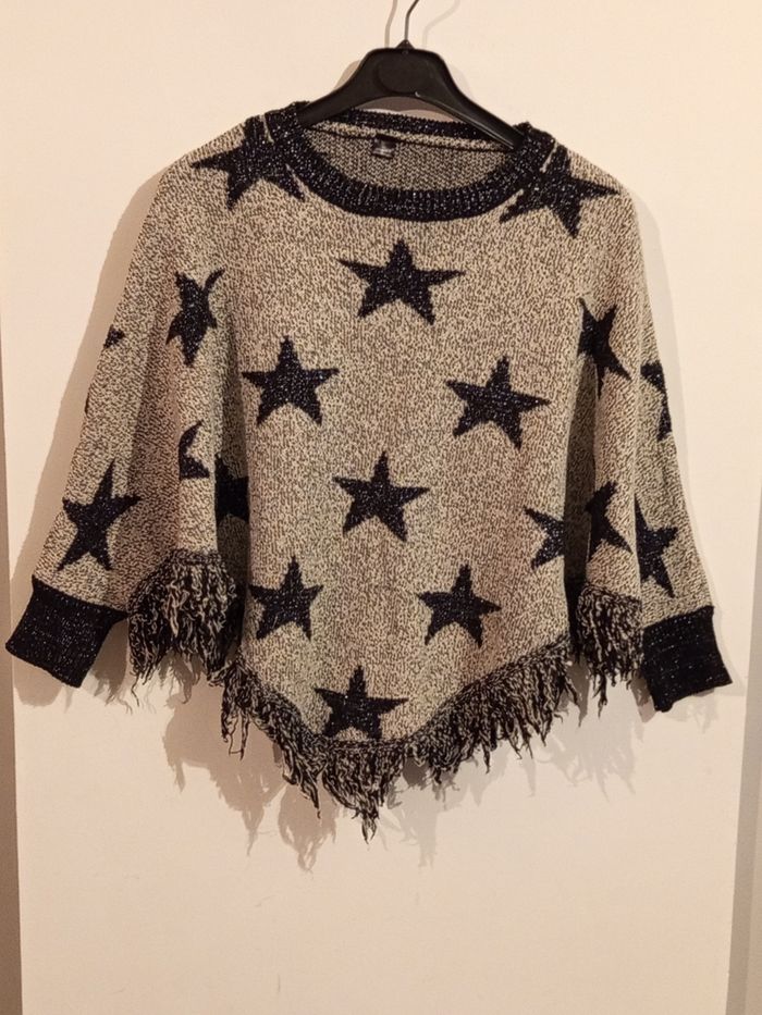 Très beau pull comme neuf manches chauve-souris gris taupe chaud et confortable. Aspect poncho. Les étoiles noires, le col et les poignets noirs sont argentés. 20% laine mais tout doux. Très peu porté.