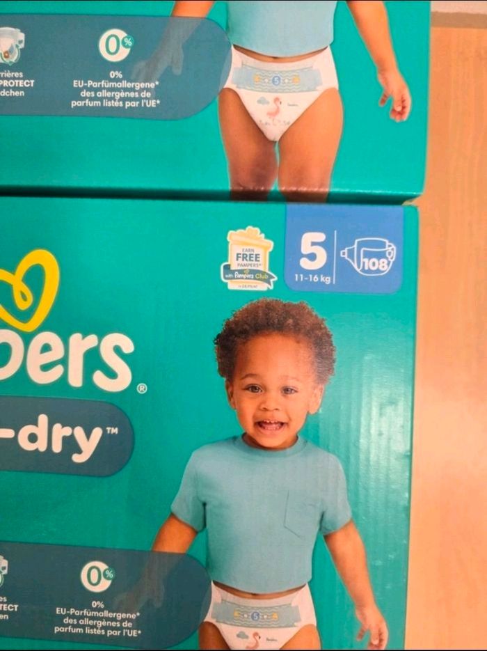 Couches Pampers Baby-Dry taille 5, conçues pour offrir une absorption longue durée et garder bébé au sec jour & nuit. Lot économique idéal pour les parents et pour faire du stock. 🧸 Caractéristiques : 🔹 Marque : Pampers 🔹 Gamme : Baby-Dry 🔹 Taille : 5 (11-16 kg) 🔹 Quantité : 2 × 108 = 216 couches 🔹 Protection longue durée 🔹 Confort & maintien au sec ✅ État : Produit jamais ouvert 📦 Envoi rapide et soigné.
