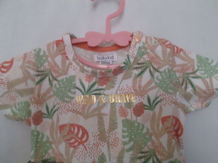 Vends robe verte Lucky Kid avec inscription dorée sur le devant. S'attache par des pressions sur l'épaule. Forme tee-shirt et petite jupe. 95 % coton + 5 % élasthanne. Taille 6 mois. Neuve, jamais portée. Pour plus de choix, allez consulter mes autres annonces.