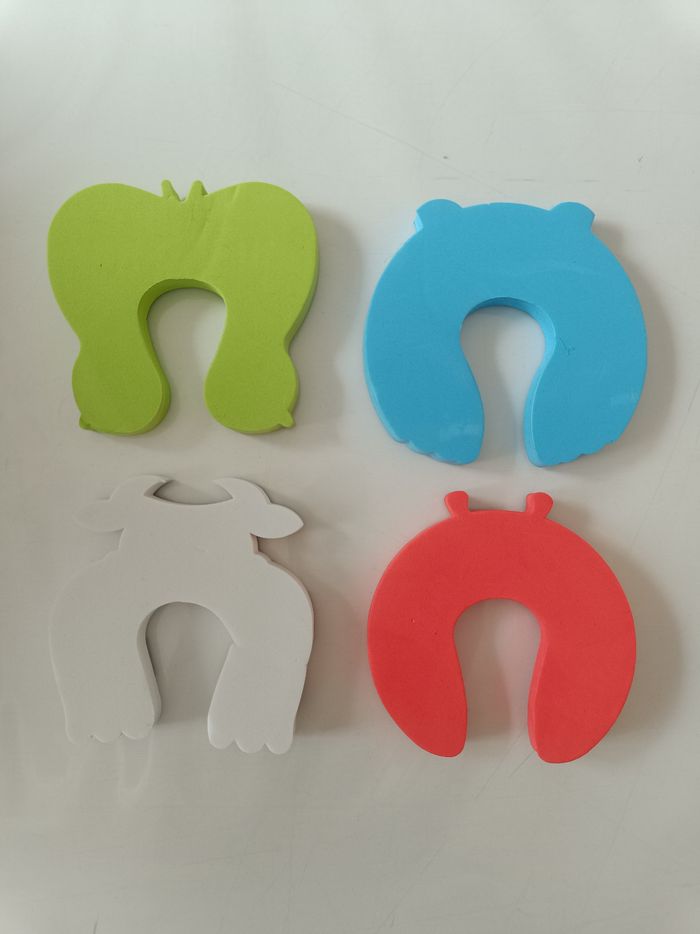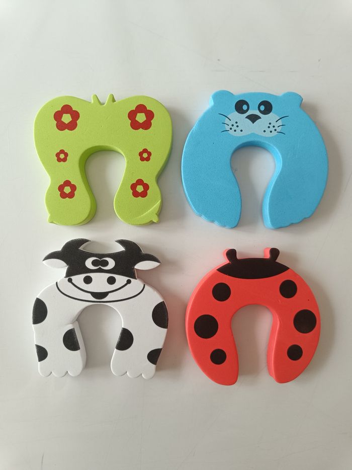 Pour porte ou fenêtre ou meuble. Protège doigts. Motifs : vache, coccinelle, phoque, papillon. Largeur : 10 cm à 11 cm. Longueur : 9,5 cm à 10,5 cm. Largeur du creux : 3,5 cm. Épaisseur : 1,2 cm. Neuf, mais quelques marque de stockage (photos). #melody45340puericulture