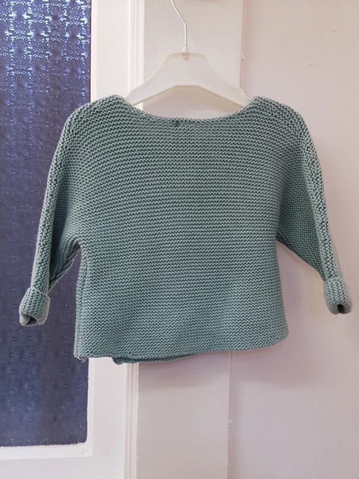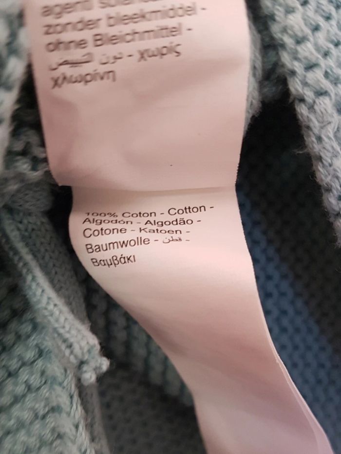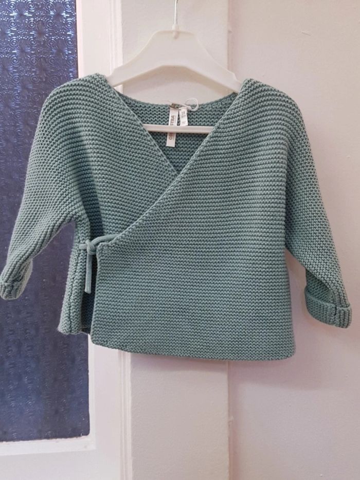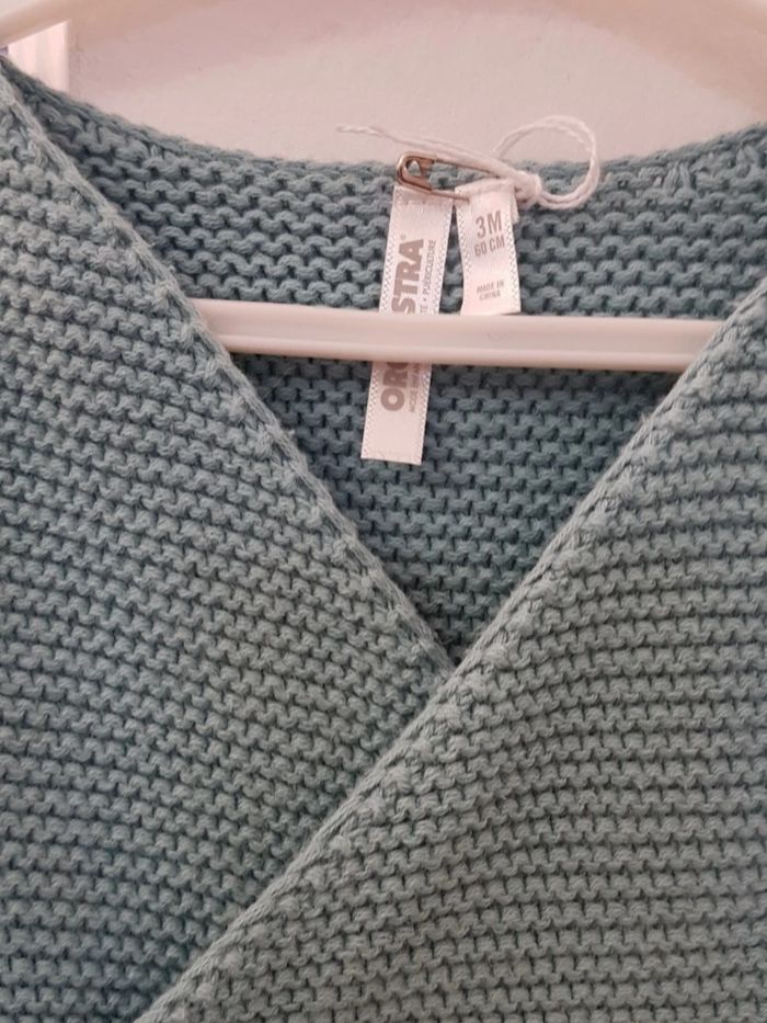 Gilet maille mousse coton bleu canard, brassière fermeture croisé par lien à nouer, très bon état; pas de tâches ou trous, envoi soigné. Orchestra 3 mois