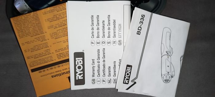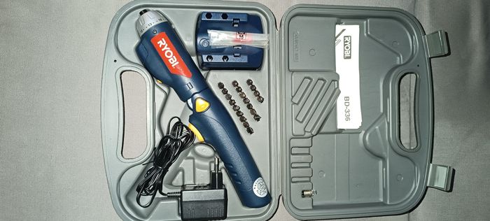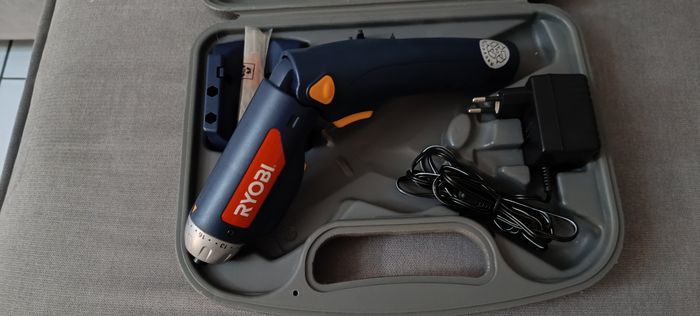 Tournevis électrique Ryobi neuf jamais servi. Vendu avec chargeur, support mural et notice dans sa malette d'origine