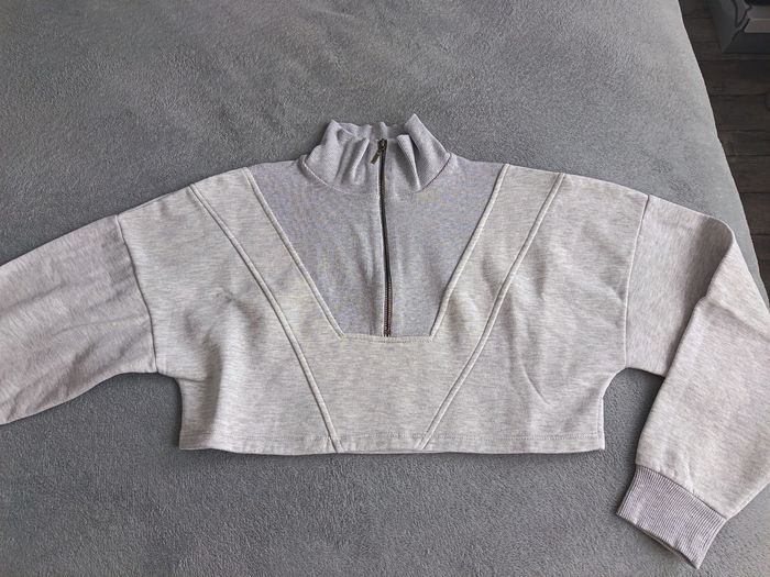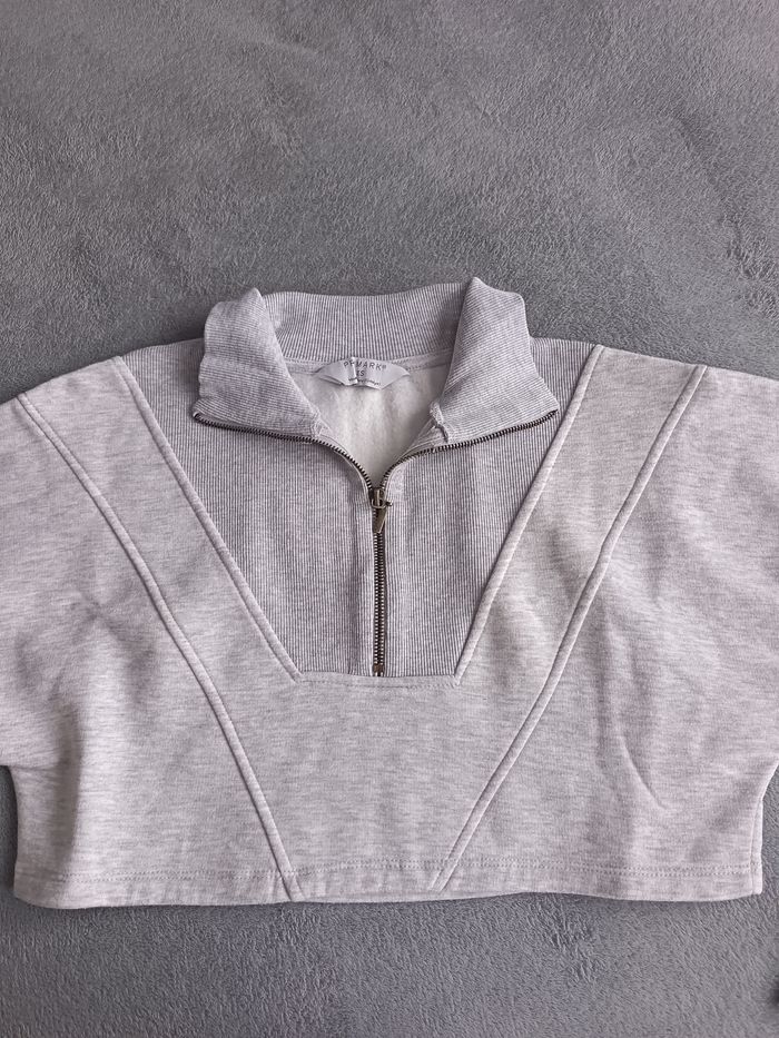 Pull court gris clair col zipper, intérieur polaire taille 34/36 oversize.