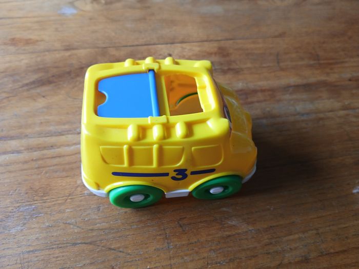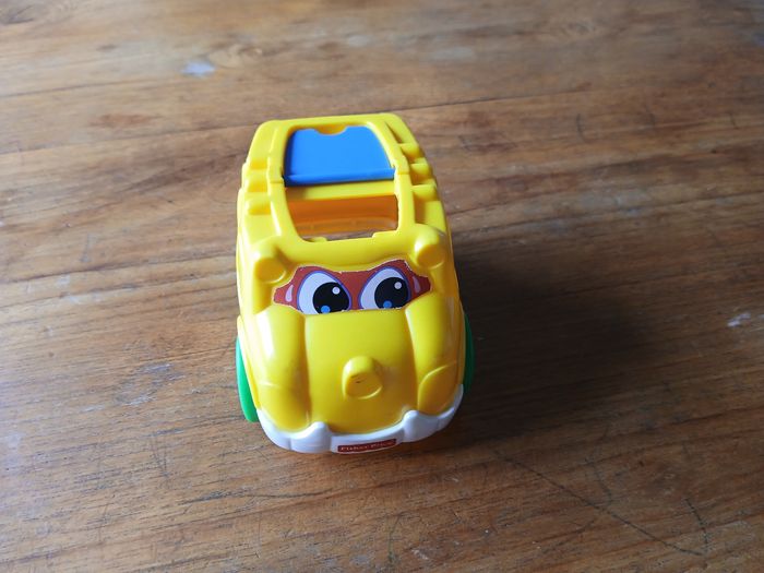 Petite voiture jaune en plastique de la marque Fisher Price. Ouverte sur le haut. Bon état
