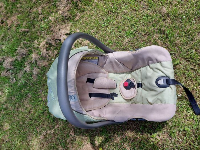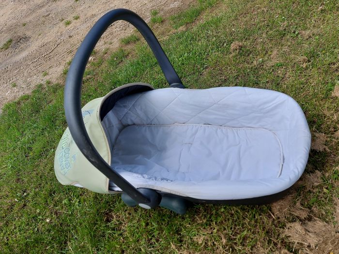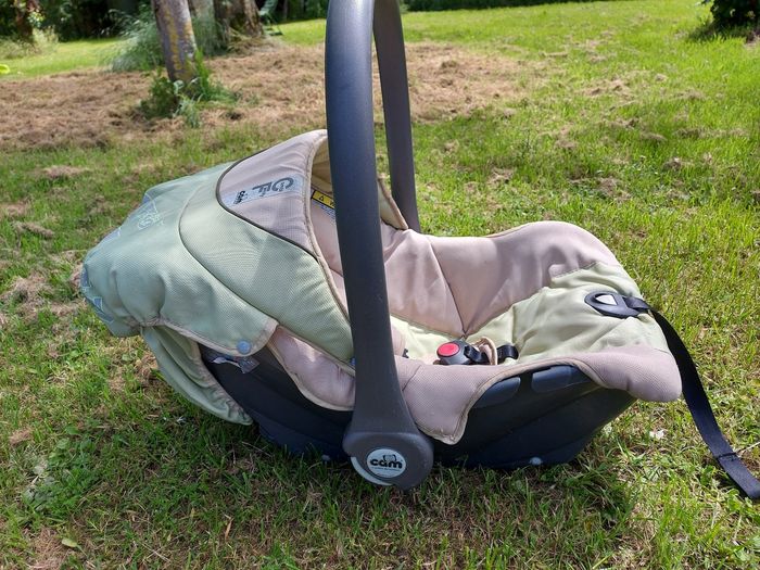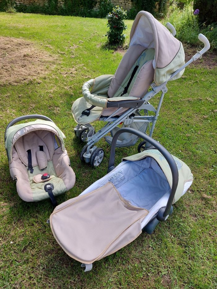 Poussette trio avec cosy et nacelle de la marque Cam et de couleurs beige et vert pâle. A beaucoup servi mais reste tres fonctionnelle. La poussette est pliable et a 4 double roues + a un petit rangement en toile dessous. Le cosy ou la nacelle peuvent se clipser sur la poussette et comme on le voit sur les photos, il y a une capote pour chacun des 3 éléments.