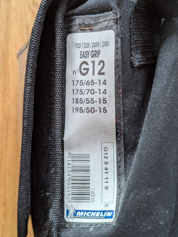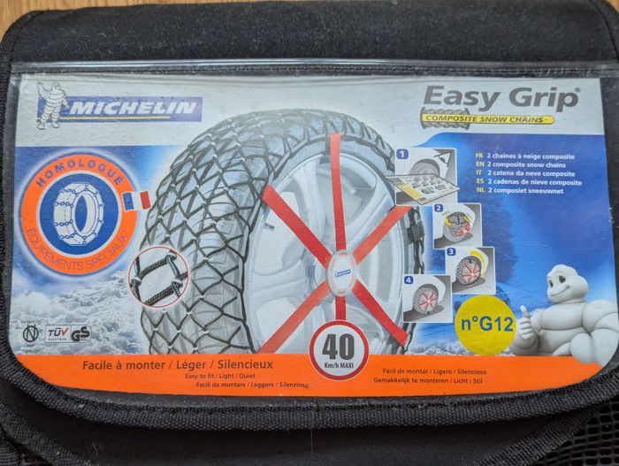 Chaînes neige Michelin Easy Grip, pratiques et rapides à installer pour conduite hivernale en toute sécurité : • Marque : Michelin • Modèle : Easy Grip G12 • État : Bon état • Compatibilité pneus :